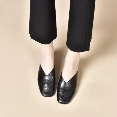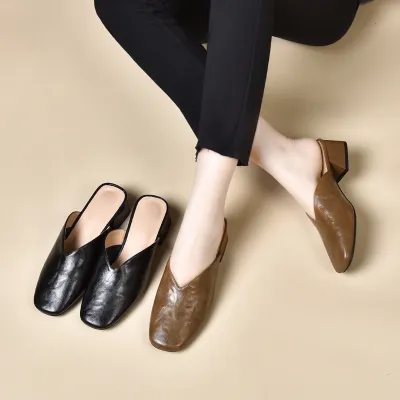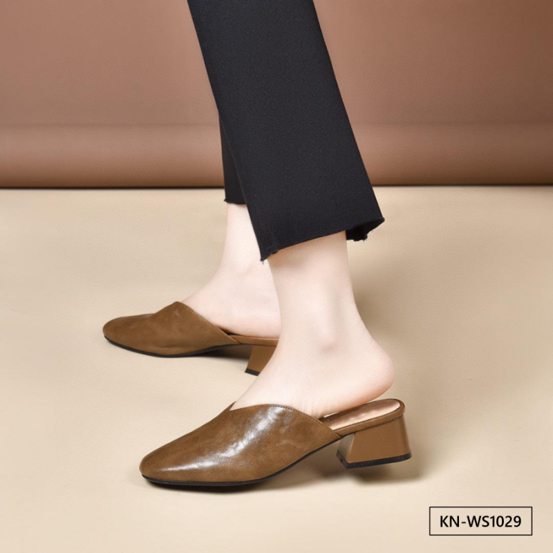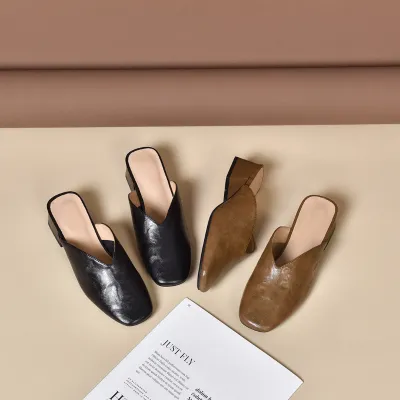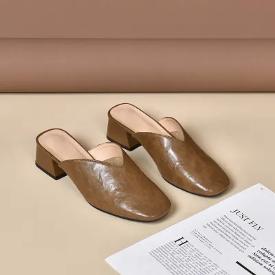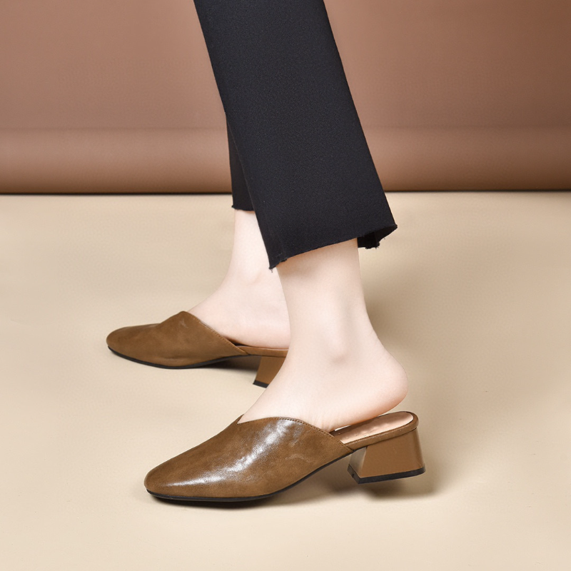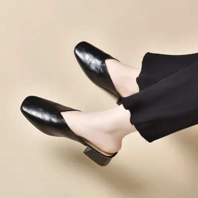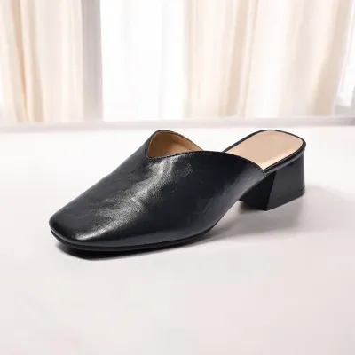 Upper Material: Genuine C-o-w-h-i-d-e leather offers both durability and a premium feel.Outsole Material: The rubber sole provides excellent traction and durability.Insole Material: PU leather ensures plush cushioning for comfort throughout the day.Toe Shape: The round head toe shape delivers a comfortable and accommodating fit.Closure Type: The slip-on design allows for quick and easy wearing.Heel Height: The 4 cm heel height gives a moderate lift with lasting comfort.Pattern Type: The solid color pattern offers a classic and adaptable style.Features: The sandal features breathability, wear-resistance, a lightweight structure, and anti-slip properties for both functionality and style.