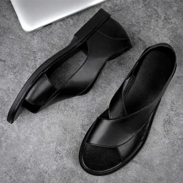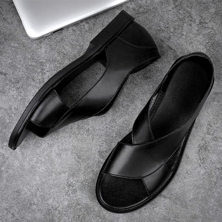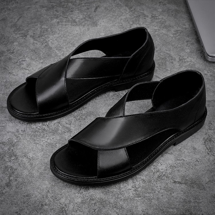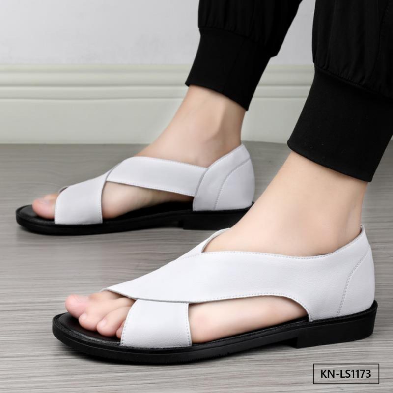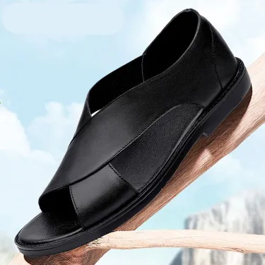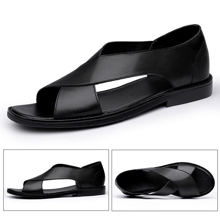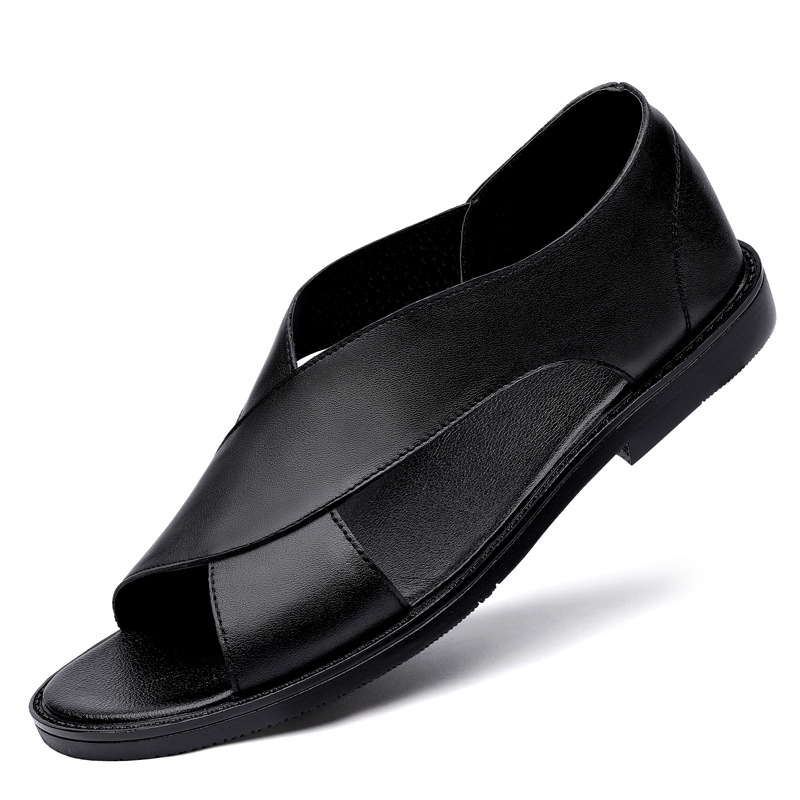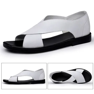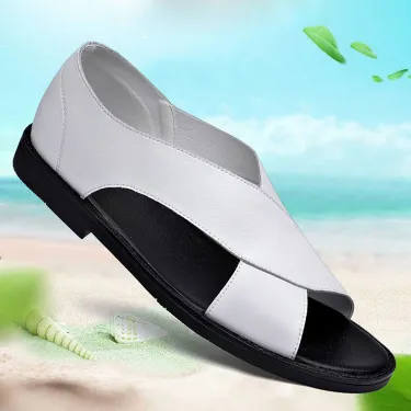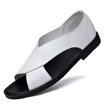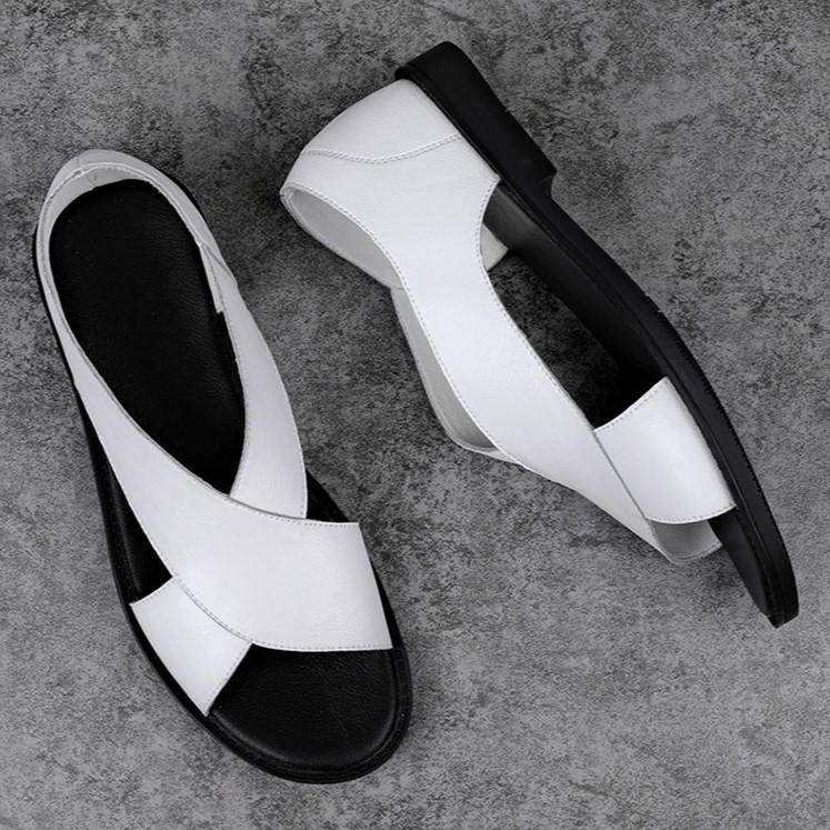 Color: The shoe comes in classic black and pristine white, offering contrasting yet timeless color choices.Upper Material: Constructed from genuine C-o-w-h-i-d-e leather, the shoe's upper ensures durability and a luxurious appearance.Outsole Material: A rubber sole provides the shoe with dependable traction and flexibility.Toe Shape: Designed with an open toe shape, the shoe enhances ventilation and comfort.Closure Type: It slips on effortlessly, ensuring convenient and quick wearability.Pattern Type: The shoe features a solid pattern, emphasizing its clean and sophisticated design.Features: Engineered for breathability, wear-resistance, lightweight comfort, and anti-slip properties, making it suitable for a variety of activities.