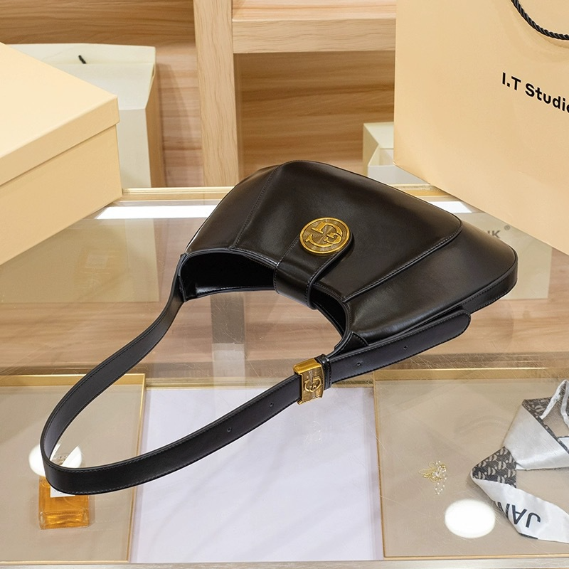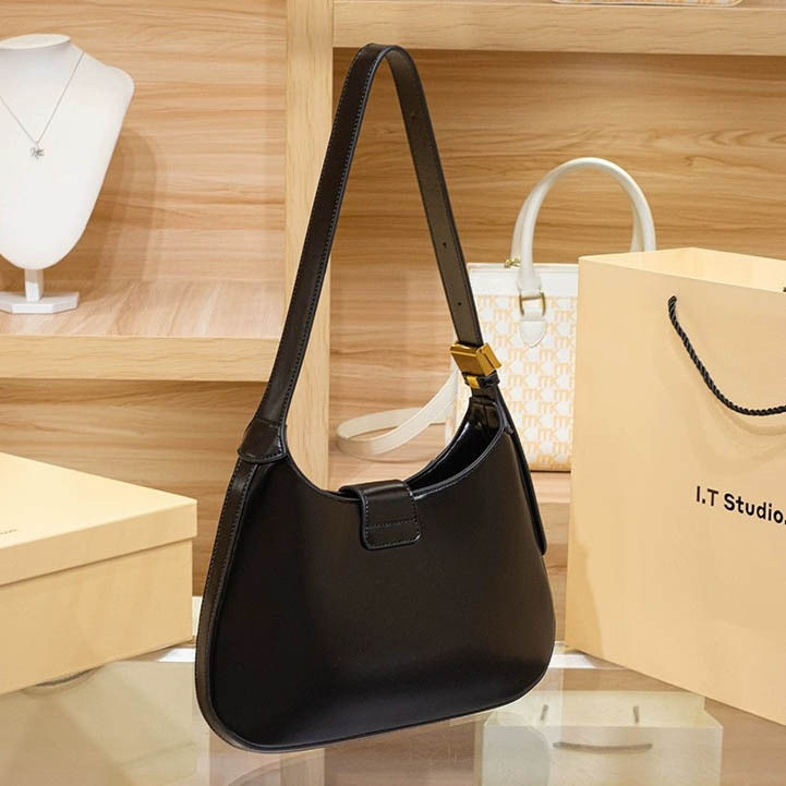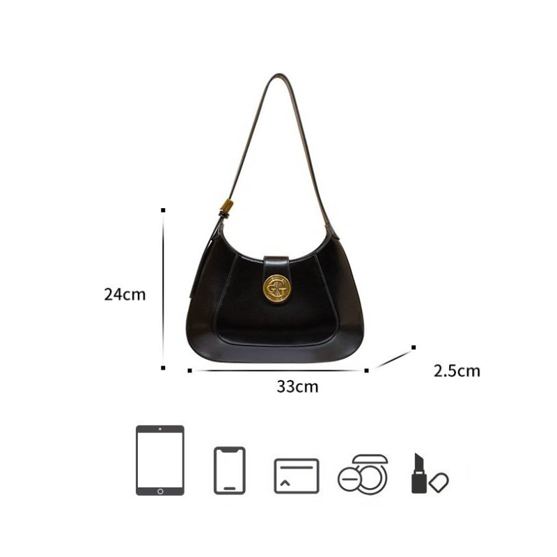 Color: The handbag comes in classic black, offering a sophisticated and versatile appearance.Upper Material: It is crafted from genuine C-o-w-h-i-d-e leather, providing a premium and durable finish.Hardness: The bag features a soft texture, ensuring comfort and flexibility.Number of Shoulder Strap: It has a single shoulder strap for convenient, hands-free carrying.Opening Method: The handbag secures with a magnetic clasp, ensuring easy access and reliable closure.Lining Texture: The interior is lined with PU leather, enhancing both luxury and durability.Pattern Type: It has a solid pattern, contributing to its timeless and elegant design.Size: Measuring 12.99 inches in length, 9.44 inches in height, and 0.98 inches in width, the handbag offers a sleek and slim profile.