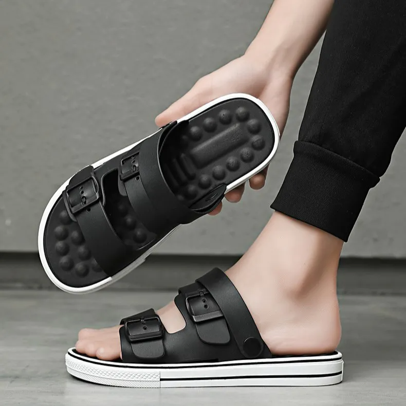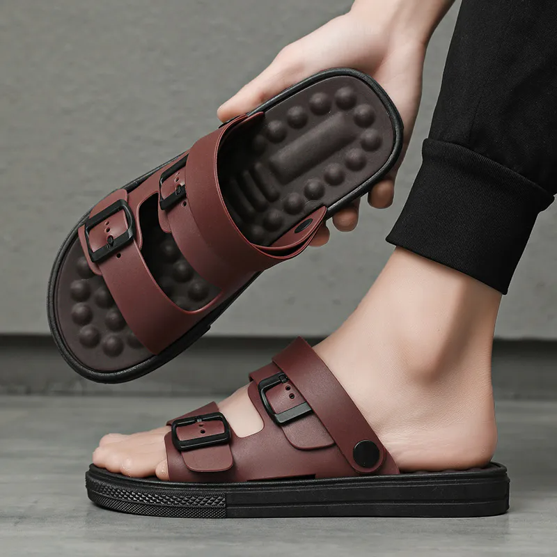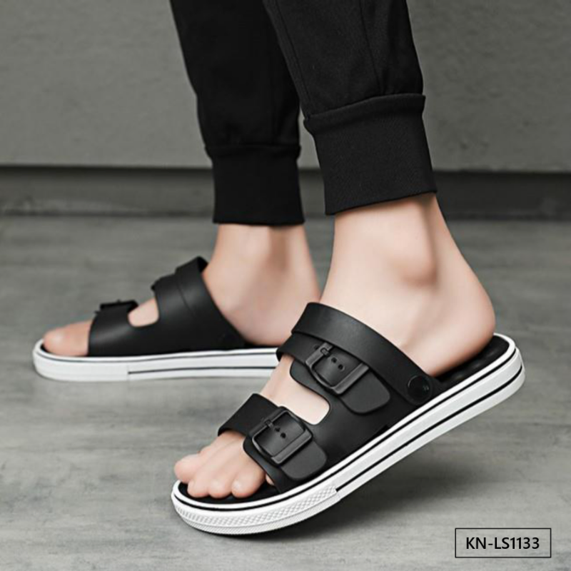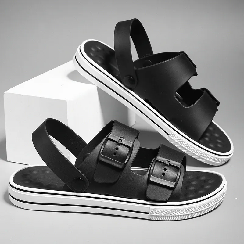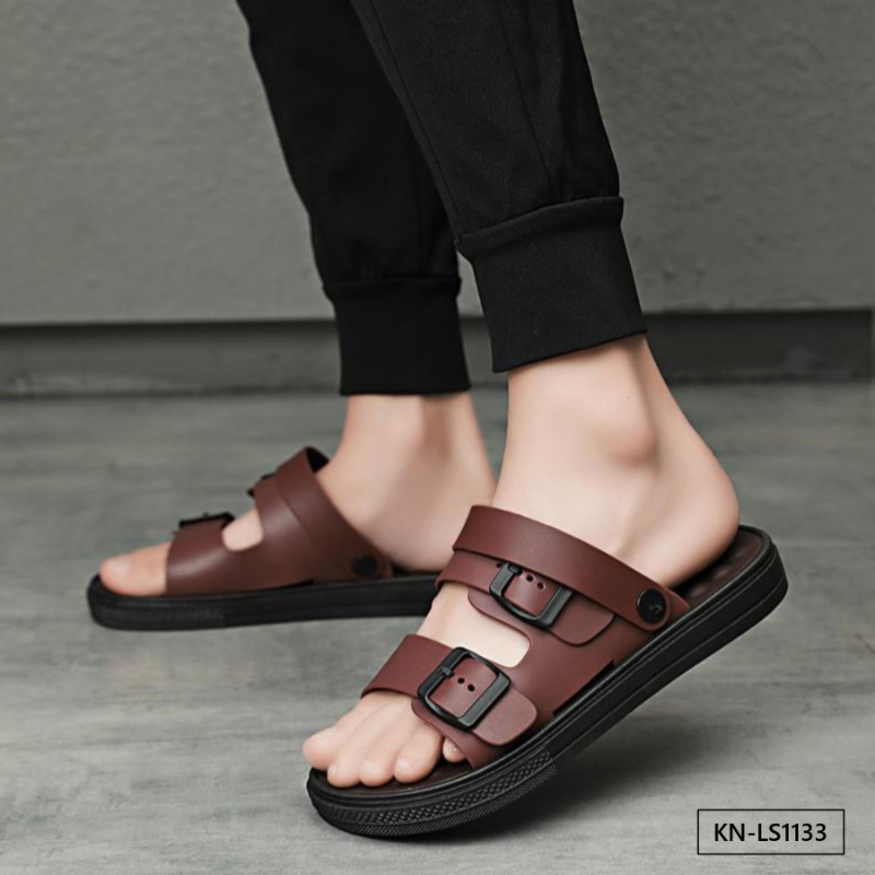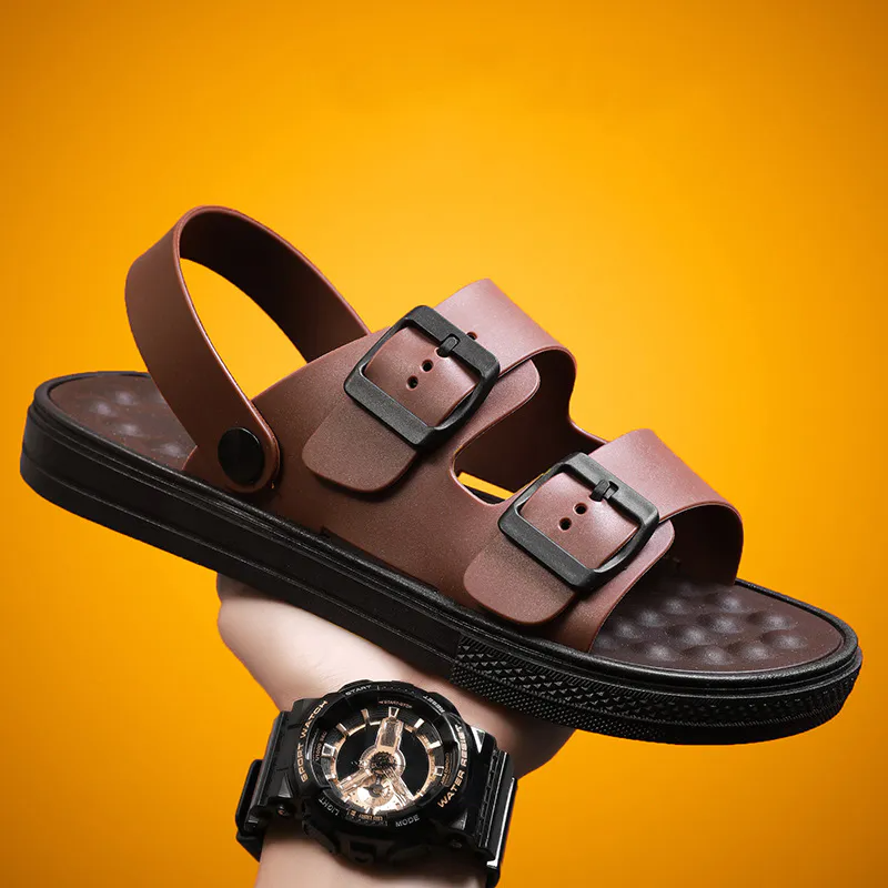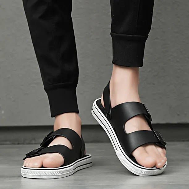 Color: The shoe combines black and brown hues.Upper Material: PU leather forms the shoe's upper.Outsole Material: The shoe's outsole utilizes EVA sole.Toe Shape: It features an open toe design.Closure Type: The shoe can be fastened with either a buckle or slipped on.Pattern Type: The shoe exhibits a solid pattern.Features: The shoe is breathable, wear-resistant, lightweight, and equipped with anti-slip properties.