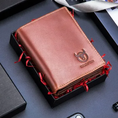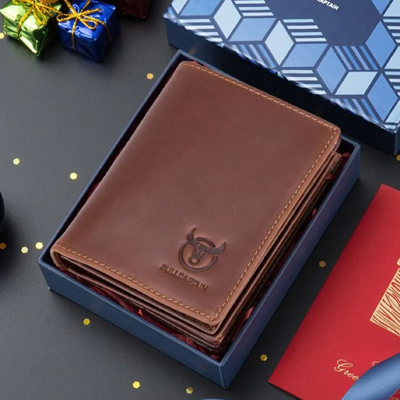 Color: The wallet is brown, adding a classic touch to its appearance.Brand: Bull Captain manufactures this wallet, known for its quality leather goods.Upper Material: The wallet is crafted from genuine leather, ensuring durability and a premium feel.Folding: It folds into two sections, providing organized storage for cards and bills.Folding of Money Clips: It also folds its money clips into two sections, enhancing its compact design.Lining: The interior is lined with polyester, offering a smooth and durable inner surface.Pattern: Its design features a solid color, maintaining a simple and elegant aesthetic.Length: It measures 12 cm in length, fitting comfortably in various pockets.Width: With a width of 9.5 cm, it strikes a balance between compactness and storage capacity.
