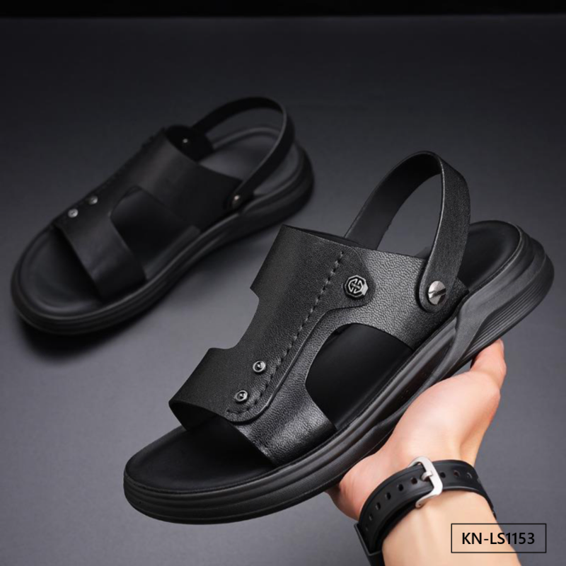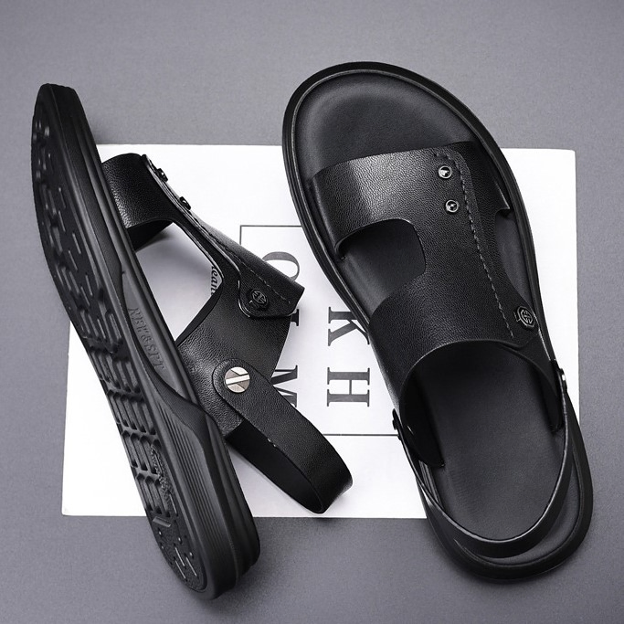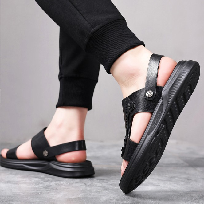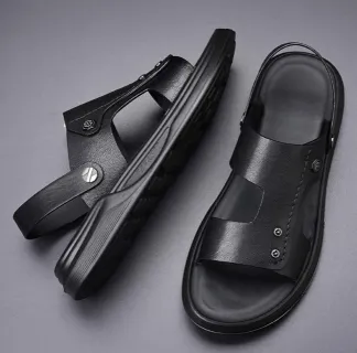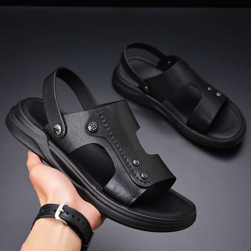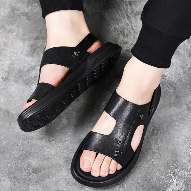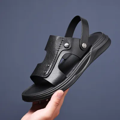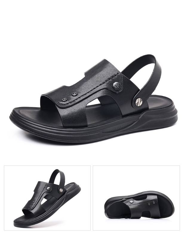 Color: The shoe comes in black and grey options.Upper Material: It is made from genuine leather, ensuring quality and durability.Outsole Material: The sole is crafted from rubber, providing traction and durability.Toe Shape: Featuring an open-toe design, it offers comfort and ventilation.Closure Type: It allows for easy wearing with slip-on functionality and a secure buckle.Pattern Type: The shoe showcases a solid pattern, adding to its classic design.Features: It is engineered to be breathable, resistant to wear, lightweight for comfort, and equipped with anti-slip properties for safety.