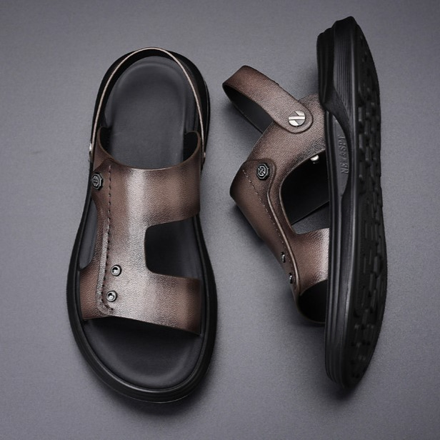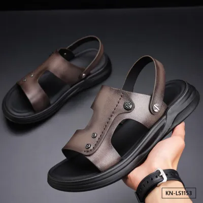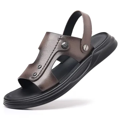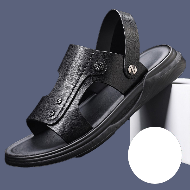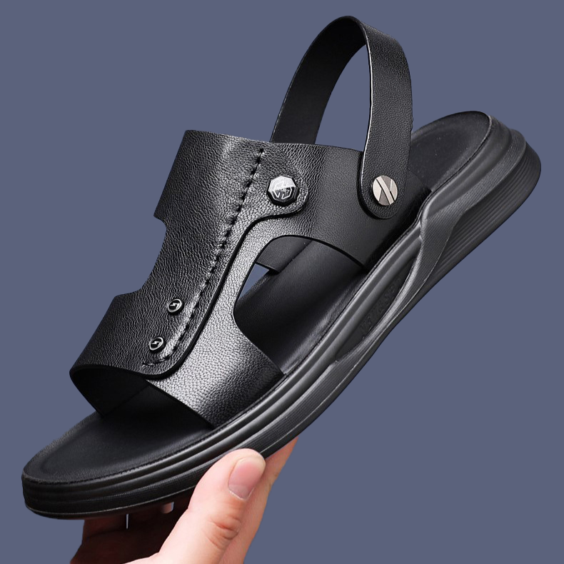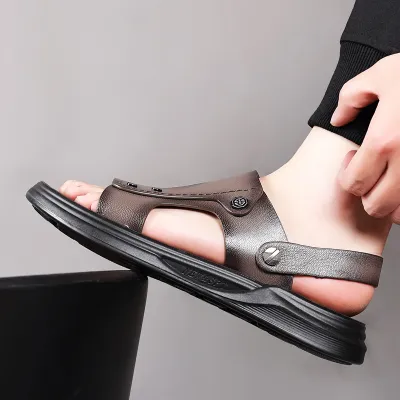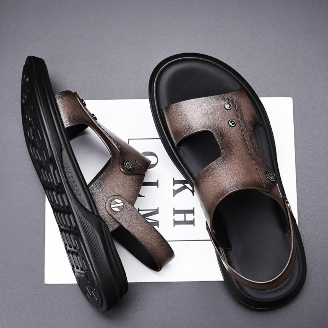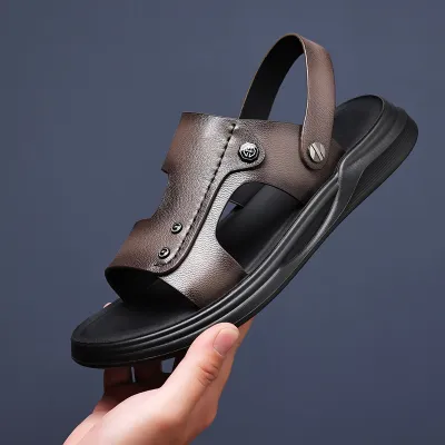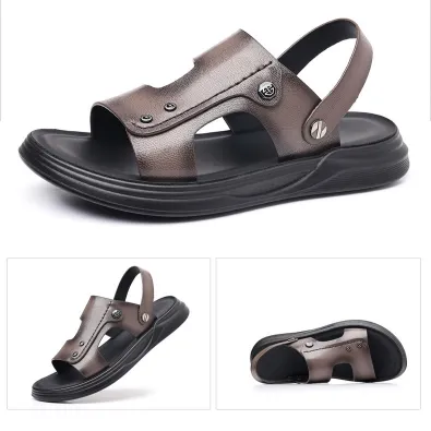Color: The shoe comes in black and grey options.Upper Material: It is made from genuine leather, ensuring quality and durability.Outsole Material: The sole is crafted from rubber, providing traction and durability.Toe Shape: Featuring an open-toe design, it offers comfort and ventilation.Closure Type: It allows for easy wearing with slip-on functionality and a secure buckle.Pattern Type: The shoe showcases a solid pattern, adding to its classic design.Features: It is engineered to be breathable, resistant to wear, lightweight for comfort, and equipped with anti-slip properties for safety.