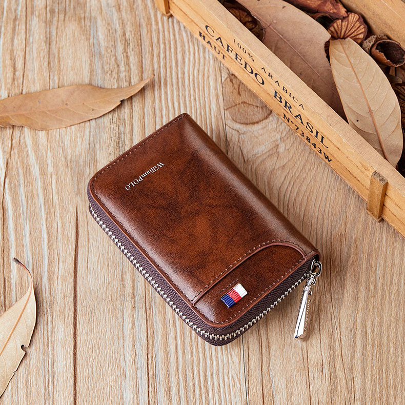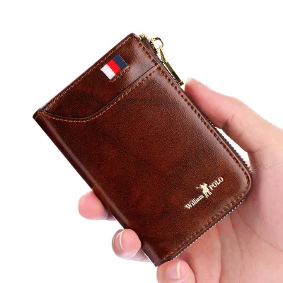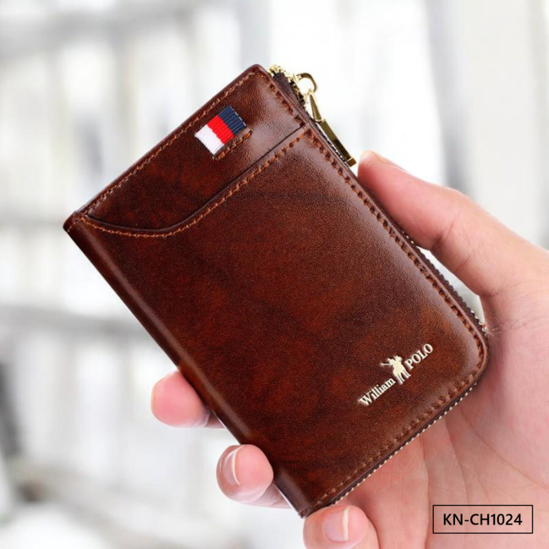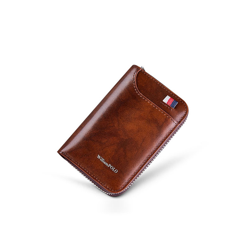 Color: The card holder features a distinctive maple leaf color pattern.Brand: William Polo combines sophisticated design with high-quality craftsmanship in this card holder.Upper Material: The card holder uses genuine leather for a luxurious and durable finish.Folding: It includes a two-fold design for efficient storage and organization.Opening Method: A zipper ensures secure closure and easy access to your cards.Lining: The polyester lining provides a smooth and resilient interior.Pattern: It has a solid color pattern, maintaining a sleek and classic appearance.Size: With measurements of 4.40" in height, 2.99" in length, and 1.25" in width, the card holder balances compactness with functionality.Weight: Weighing 350 grams, the card holder offers a substantial and sturdy feel.