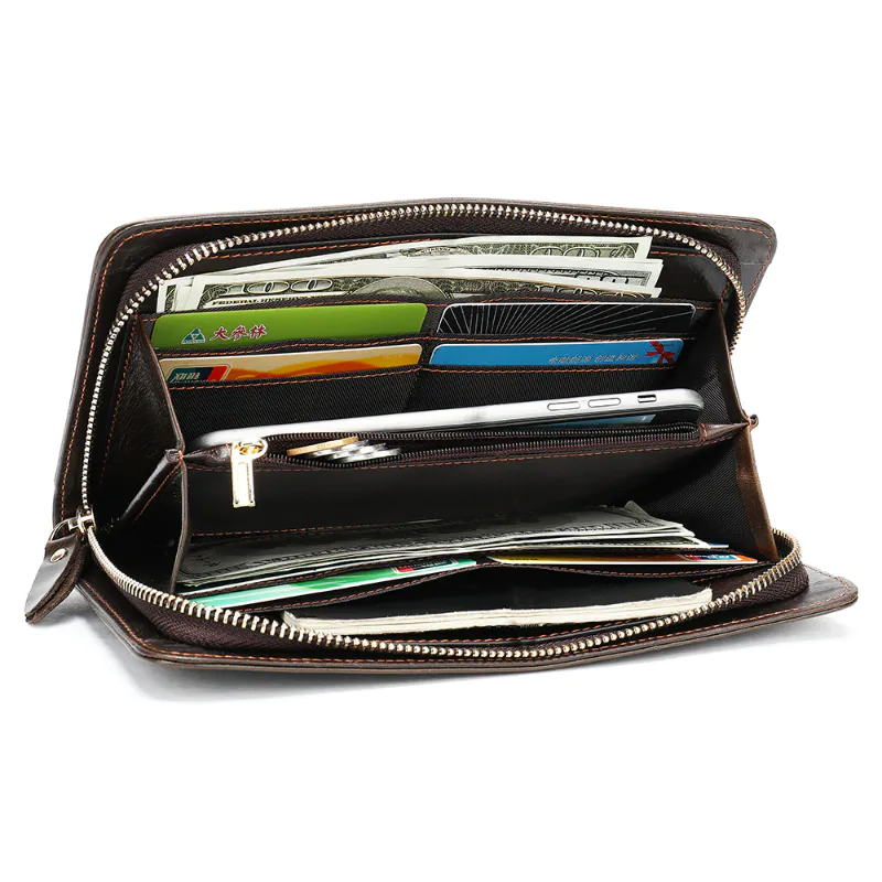 Color: This wallet comes in both classic black and the unique Youca shade.Brand: FUNNY presents this stylish and functional wallet.Upper Material: Crafted from genuine leather, the wallet ensures premium quality and durability.Opening Method: It features a secure zipper opening method for easy access.Folding: The 2-fold design enhances convenience and organization.Lining: Polyester lining inside the wallet provides a smooth and sturdy finish.Pattern: The solid color pattern gives it a sleek and versatile look.Length: Measuring 8.46 inches in length, this wallet offers ample space for your essentials.Width: At 4.72 inches wide, it is designed to fit comfortably in your hand or bag.