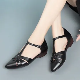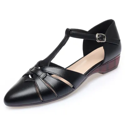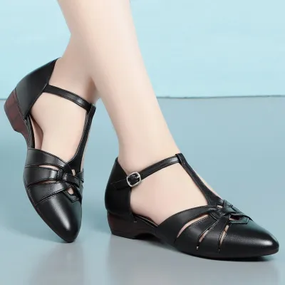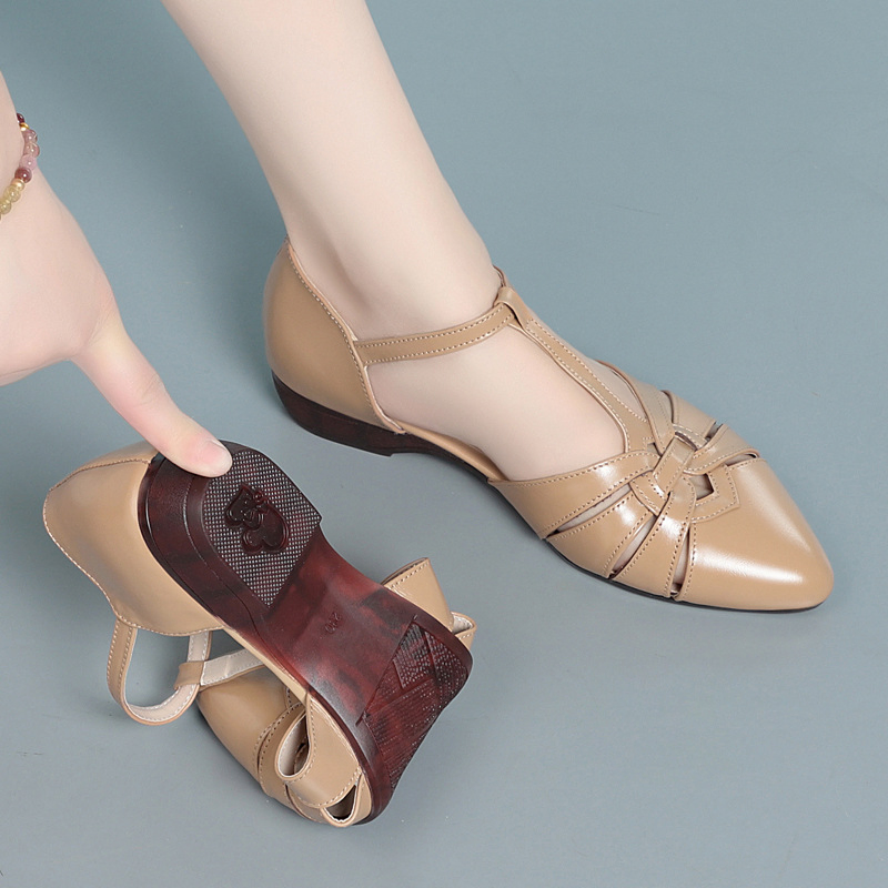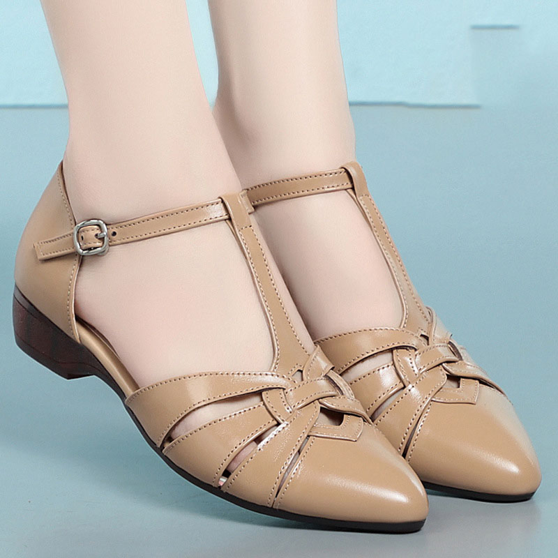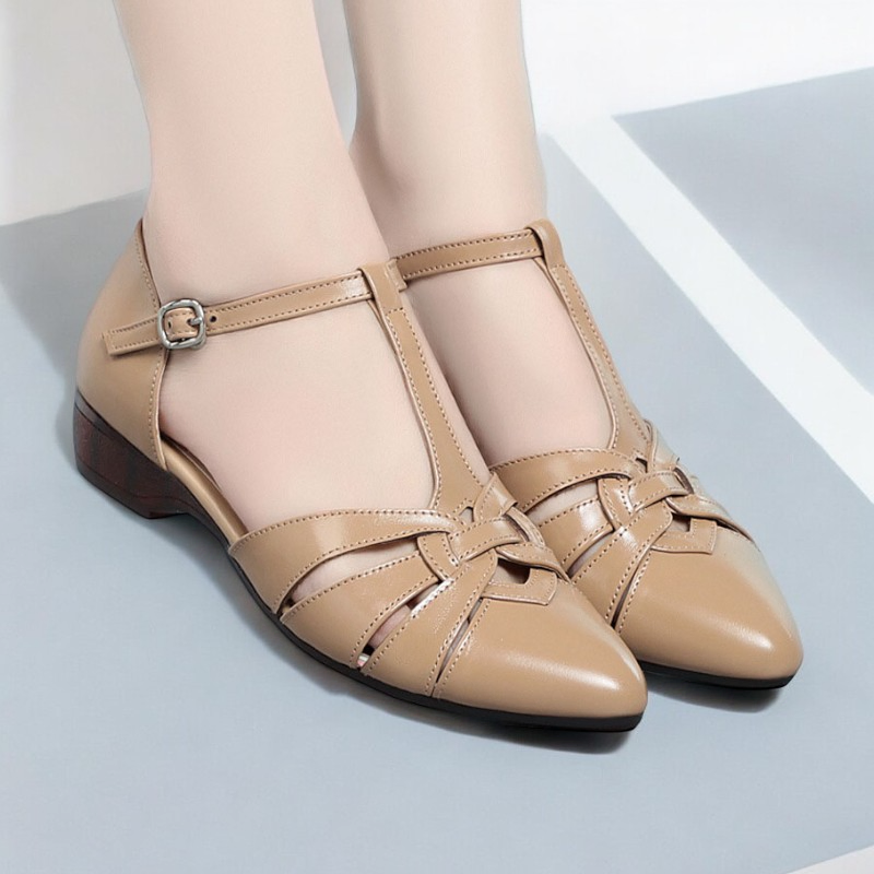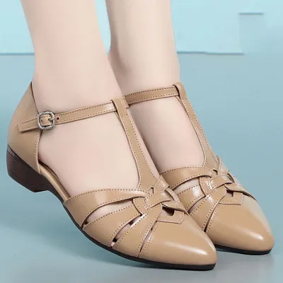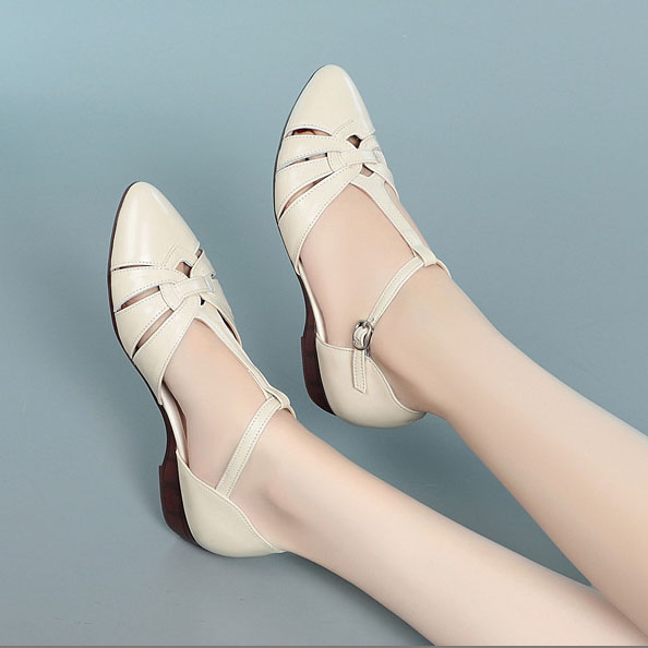 Color: Available in apricot, black, and off white for versatile styling.Upper Material: Genuine leather provides a high-quality, durable finish.Outsole Material: Rubber sole ensures a firm grip and lasting wear.Insole Material: PU leather offers a comfortable and cushioned feel.Toe Shape: The pointed toe shape adds a touch of elegance and sophistication.Closure Type: The one-piece buckle strap allows for easy adjustments and a secure fit.Heel Height: With a 2.5 cm heel height, these sandals offer a subtle lift without compromising comfort.Pattern Type: The solid color pattern maintains a classic and timeless look.Features: Designed to be breathable, wear-resistant, lightweight, and anti-slip for enhanced comfort and practicality.