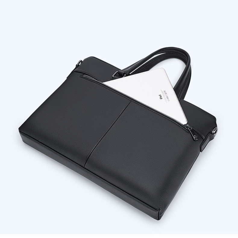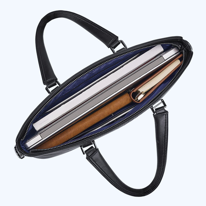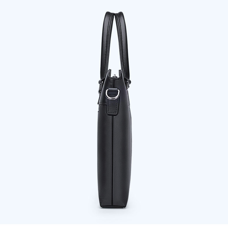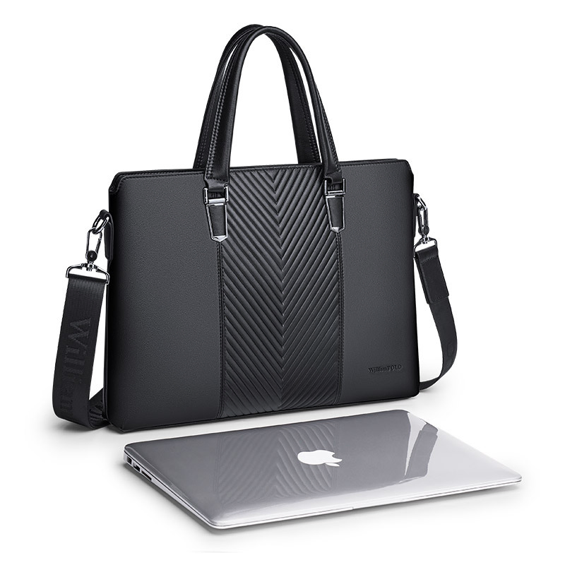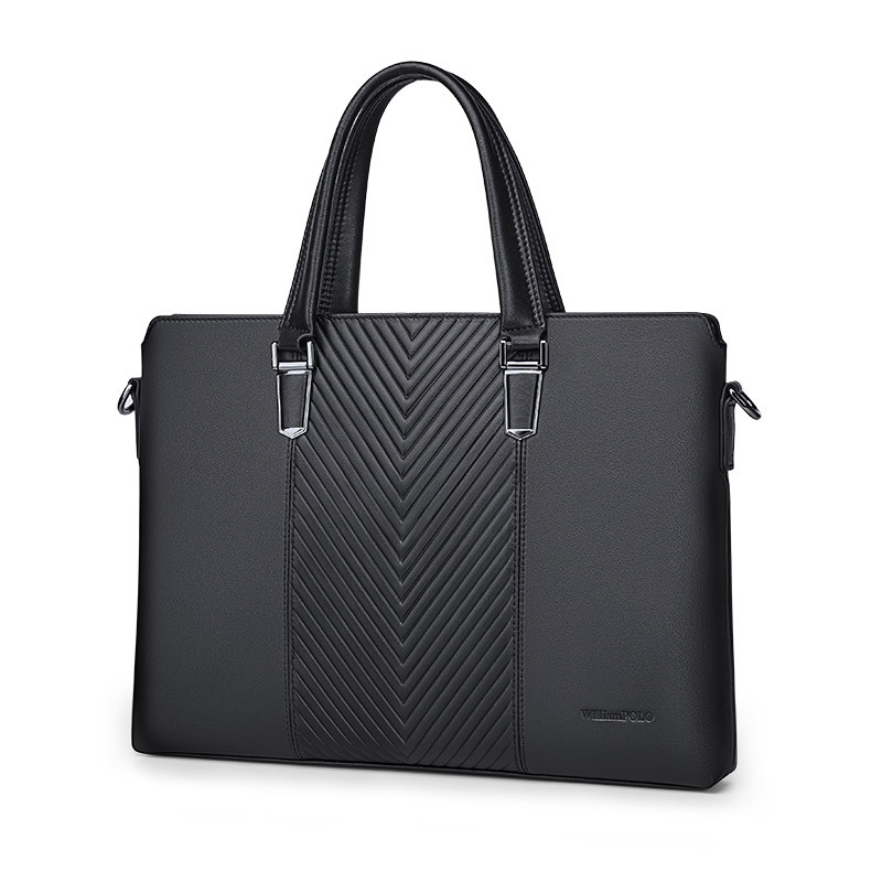 Color: The bag features a timeless black color, enhancing its sophisticated and adaptable style.Brand: William POLO offers this bag with a reputation for quality and elegant design.Upper Material: The upper material is genuine leather, providing a touch of luxury and long-lasting durability.Number of Shoulder Straps: It comes with a single shoulder strap, ensuring convenient and comfortable carrying.Opening Method: A zipper closure secures the bag’s contents and allows for quick access.Hardness: The bag has a soft feel, adding comfort and flexibility to its use.Shape: It is designed as a handbag, blending practicality with a chic and classic form.Pattern: The solid color pattern contributes to the bag's sleek and minimalist look.Lining Material: The polyester lining inside the bag ensures durability and is easy to maintain.Size: Measuring 14.64" (L) x 10.43" (H) x 2.16" (W), the bag provides ample space while maintaining a streamlined profile.Features: The bag includes multi-functionality, a 15" computer compartment, and waterproof capabilities for versatile use.Weight: Weighing 1 kg, the bag remains lightweight and effortless to carry.