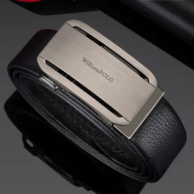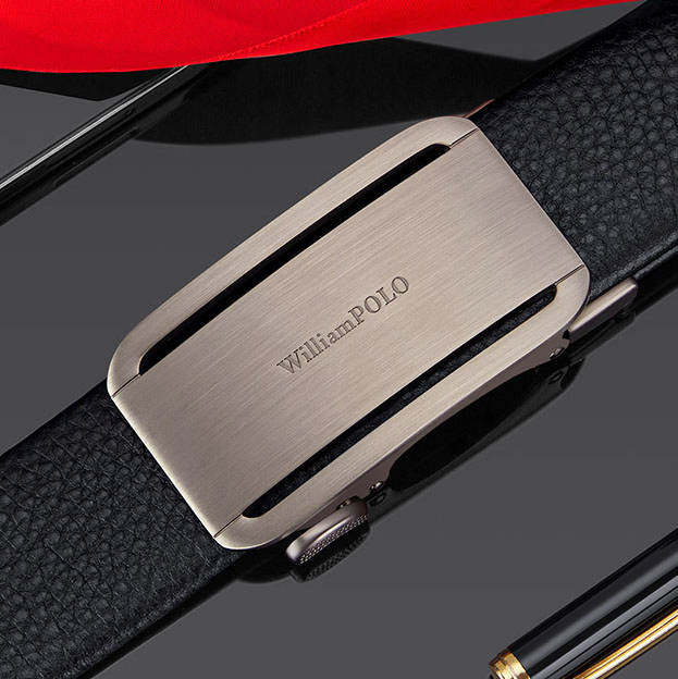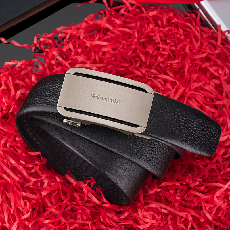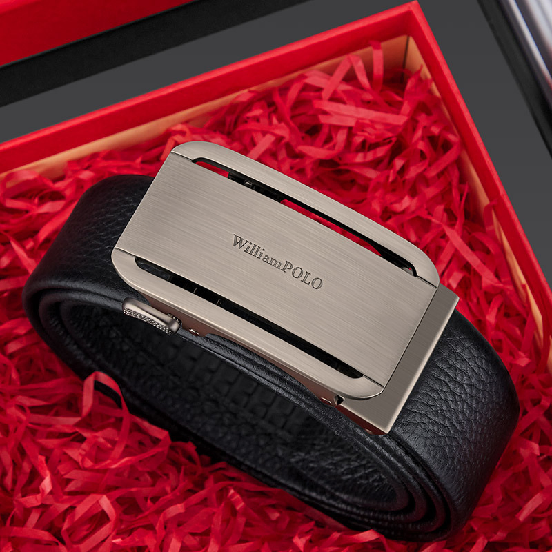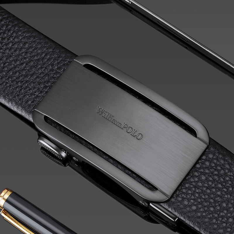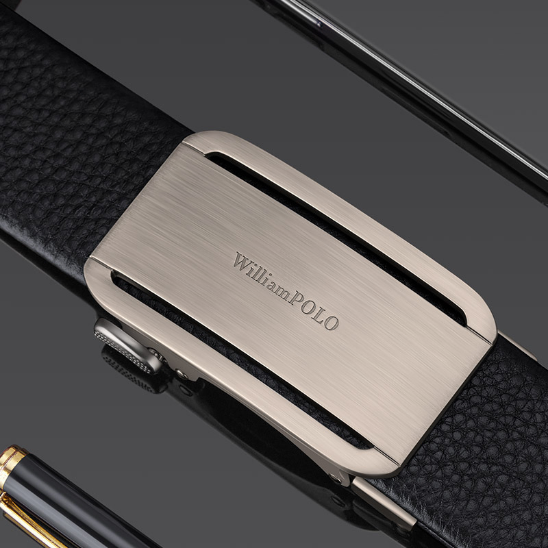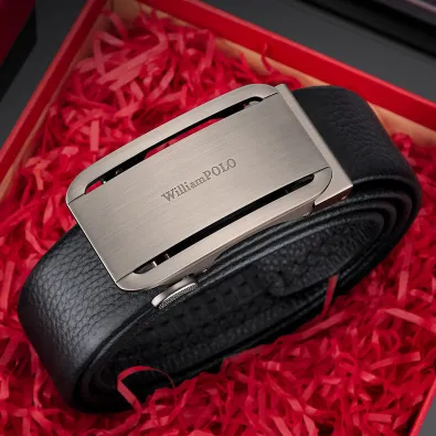 Buckle Color: The buckle combines gunmetal and silver for a modern, sophisticated look.Belt Color: The belt showcases a deep, versatile black.Brand: William POLO designs this belt with a commitment to high-quality craftsmanship.Upper Material: Genuine leather offers a blend of luxury and strength.Fastening Method: The automatic buckle facilitates quick and secure adjustments.Lining: Polyester lining enhances the belt's durability and comfort.Pattern: The belt features a solid color, providing a sleek and minimalist appearance.Length: The belt measures 120 ”, accommodating a broad range of waist sizes.Width: With a width of 3.8 ”, the belt delivers a balanced and stylish profile.Weight: At 350 grams, the belt balances sturdiness with ease of wear.