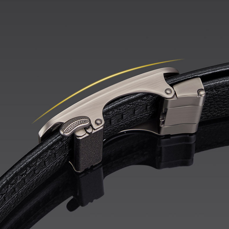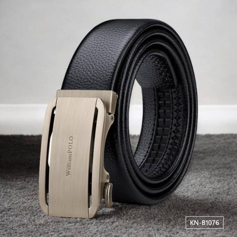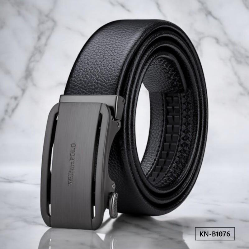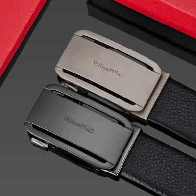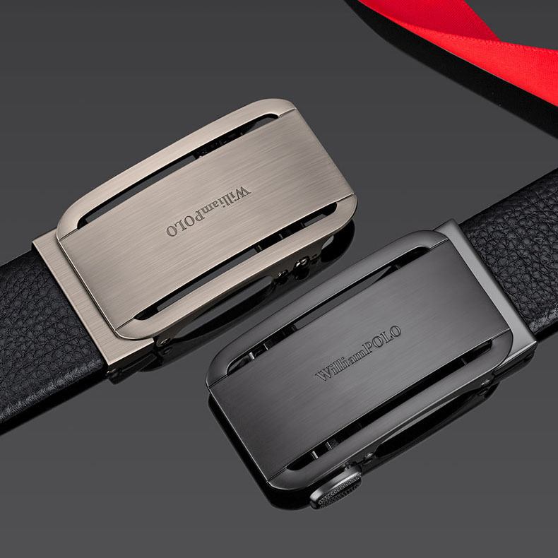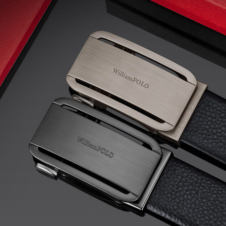 Buckle Color: The buckle combines gunmetal and silver for a modern, sophisticated look.Belt Color: The belt showcases a deep, versatile black.Brand: William POLO designs this belt with a commitment to high-quality craftsmanship.Upper Material: Genuine leather offers a blend of luxury and strength.Fastening Method: The automatic buckle facilitates quick and secure adjustments.Lining: Polyester lining enhances the belt's durability and comfort.Pattern: The belt features a solid color, providing a sleek and minimalist appearance.Length: The belt measures 120 ”, accommodating a broad range of waist sizes.Width: With a width of 3.8 ”, the belt delivers a balanced and stylish profile.Weight: At 350 grams, the belt balances sturdiness with ease of wear.