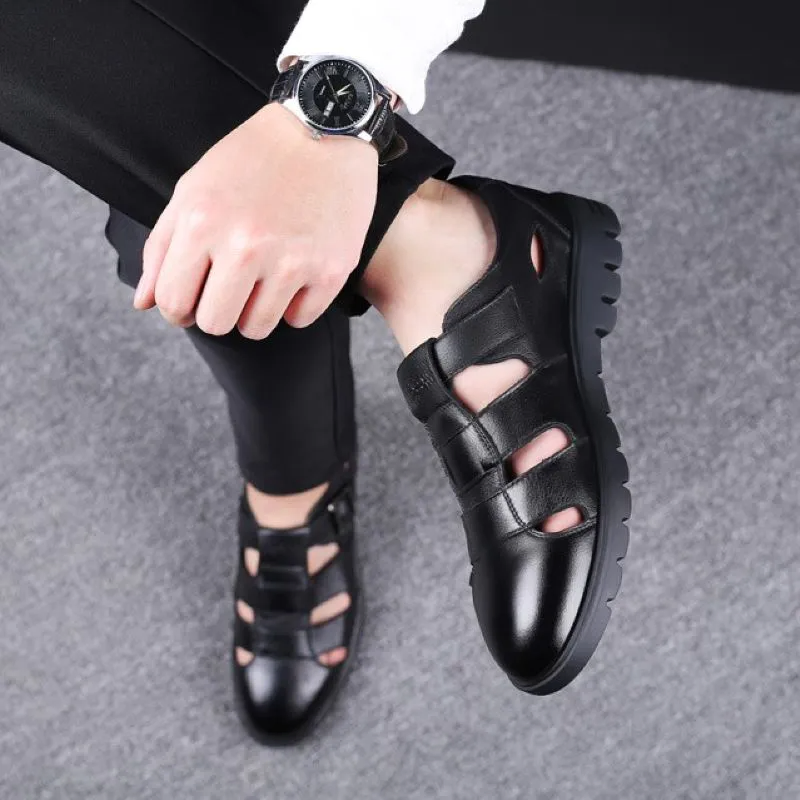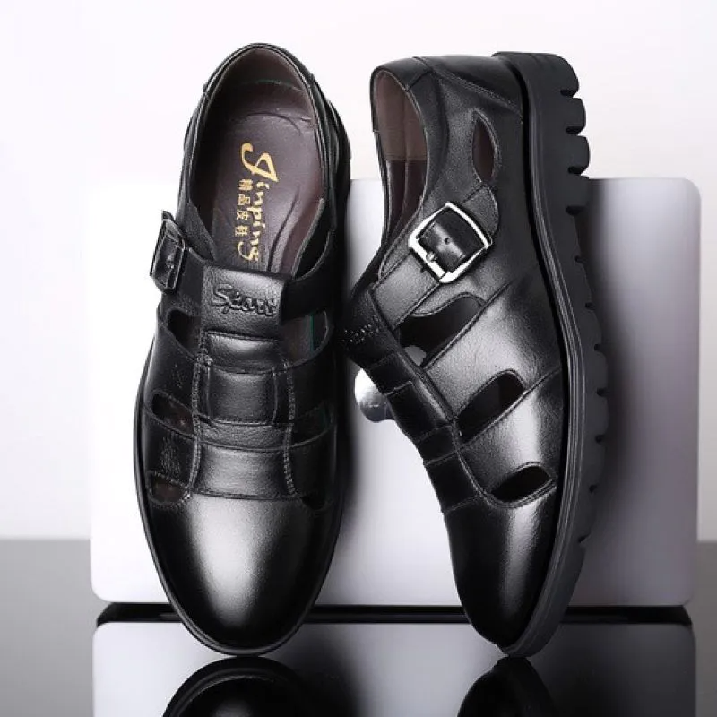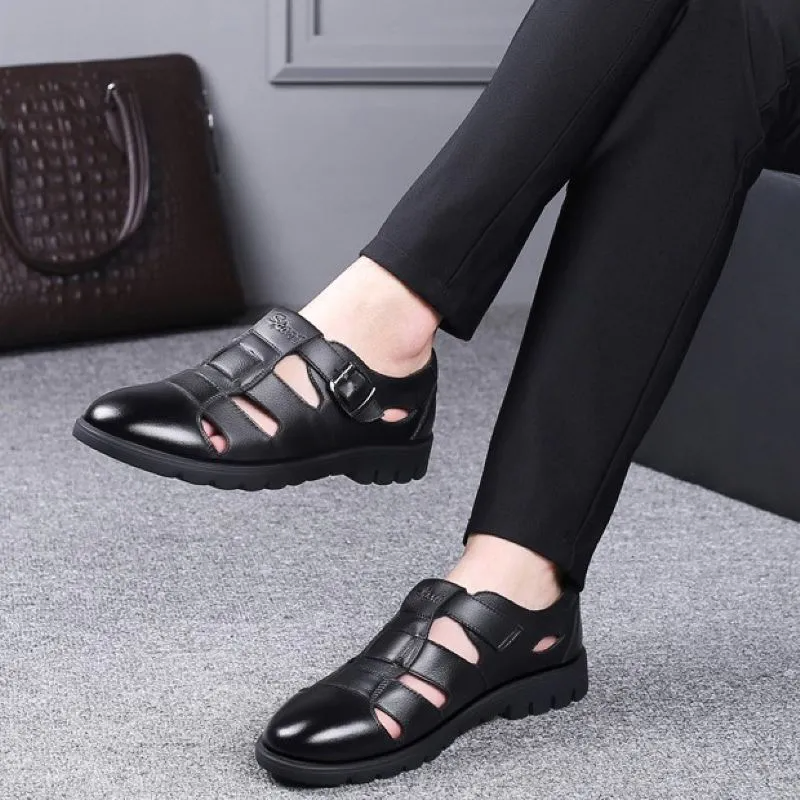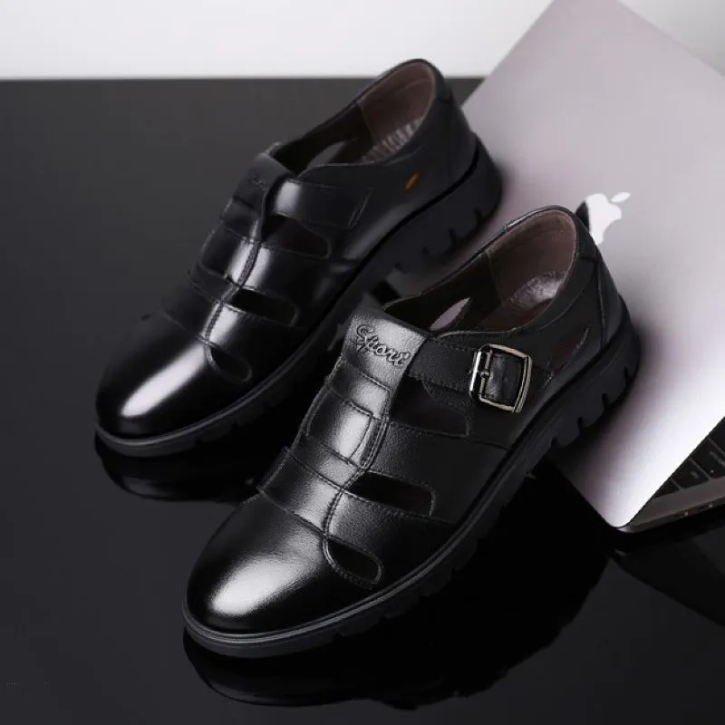 Color: The shoe is presented in classic black.Upper Material: Genuine leather constructs the durable and stylish upper.Outsole Material: Rubber forms the outsole, ensuring durability and traction.Inner Material: Microfiber leather lines the interior for comfort and breathability.Toe Shape: It features a round head toe shape, offering comfort and roominess.Closure Type: The shoe is designed with a slip-on closure for easy wearability.Pattern Type: The shoe showcases a solid pattern, emphasizing simplicity and elegance.Features: Engineered to be breathable, wear-resistant, lightweight, and equipped with anti-slip properties for comfort and functionality.
