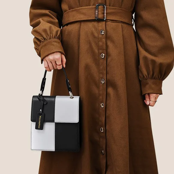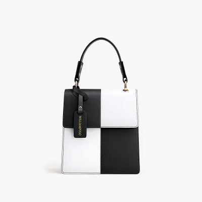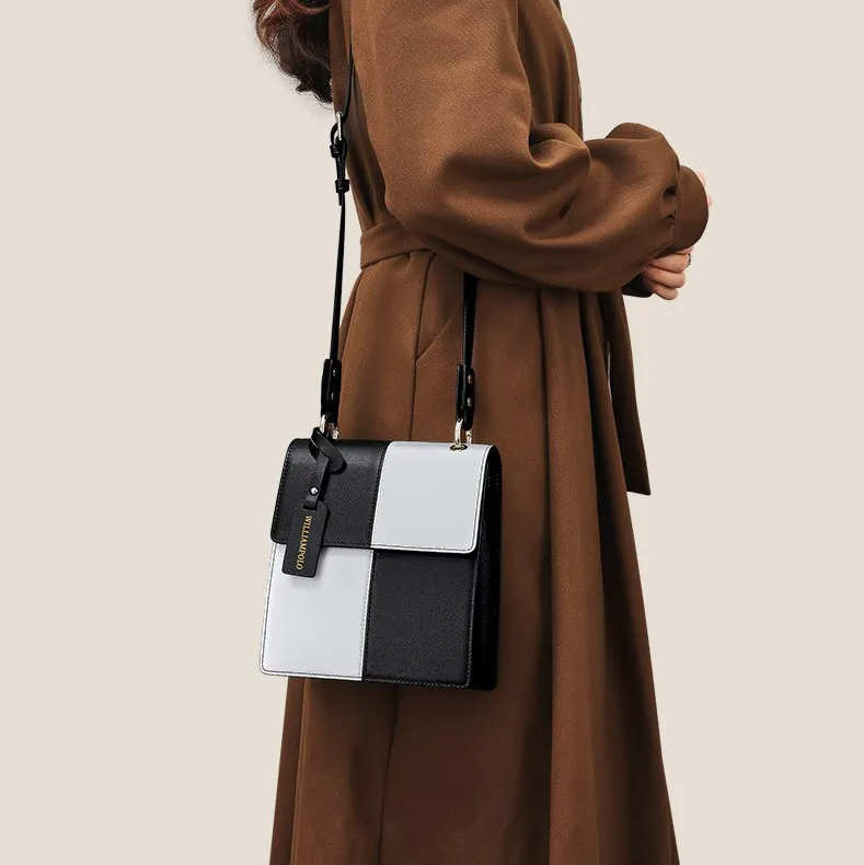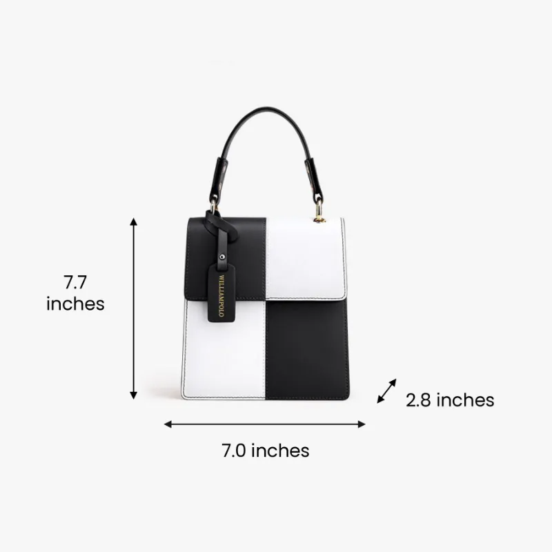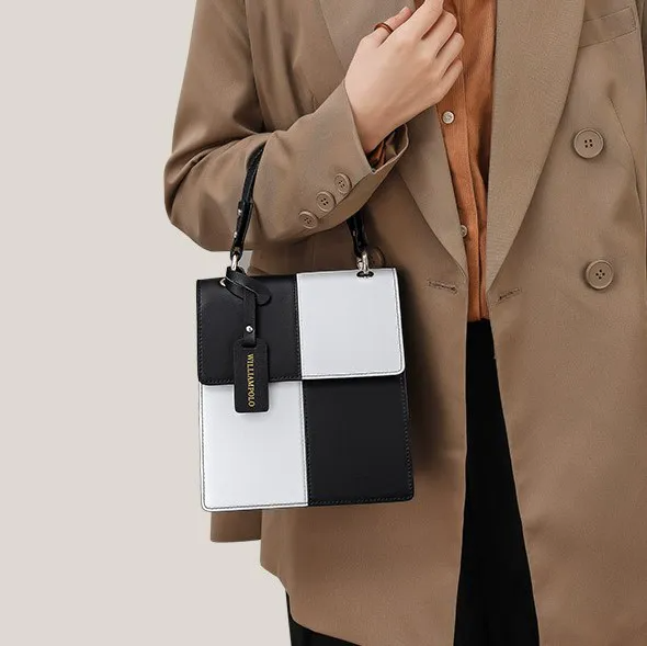 Color: The handbag features a stylish black-and-white color scheme, adding a bold and sophisticated contrast.Upper Material: Leather serves as the primary material, offering a classic and durable exterior.Package Internal Structure: The interior includes a mobile phone bag, providing a dedicated space for your device.Lining Texture: PU lines the inside of the bag, ensuring a sleek and easy-to-clean surface.Bag Trend Style: The plaid design fits within the street fashion trend, merging practicality with contemporary style.Brand: William POLO is the brand behind this handbag, known for its quality and fashionable designs.Shape: The vertical square shape contributes to a modern and structured look.Lifting Method: A soft handle provides a comfortable grip while adding a touch of elegance.Hardness: The bag features a soft surface, enhancing comfort and flexibility in use.Size: With a length of 19.6 cm and a width of 17.8 cm, the bag offers ample space while remaining compact.