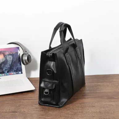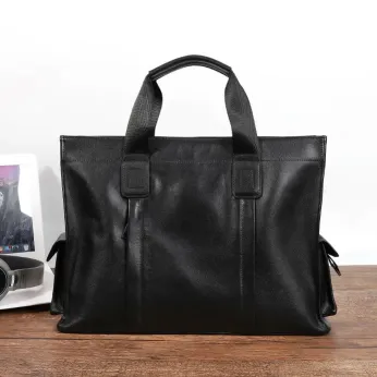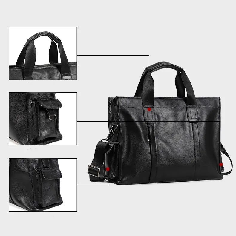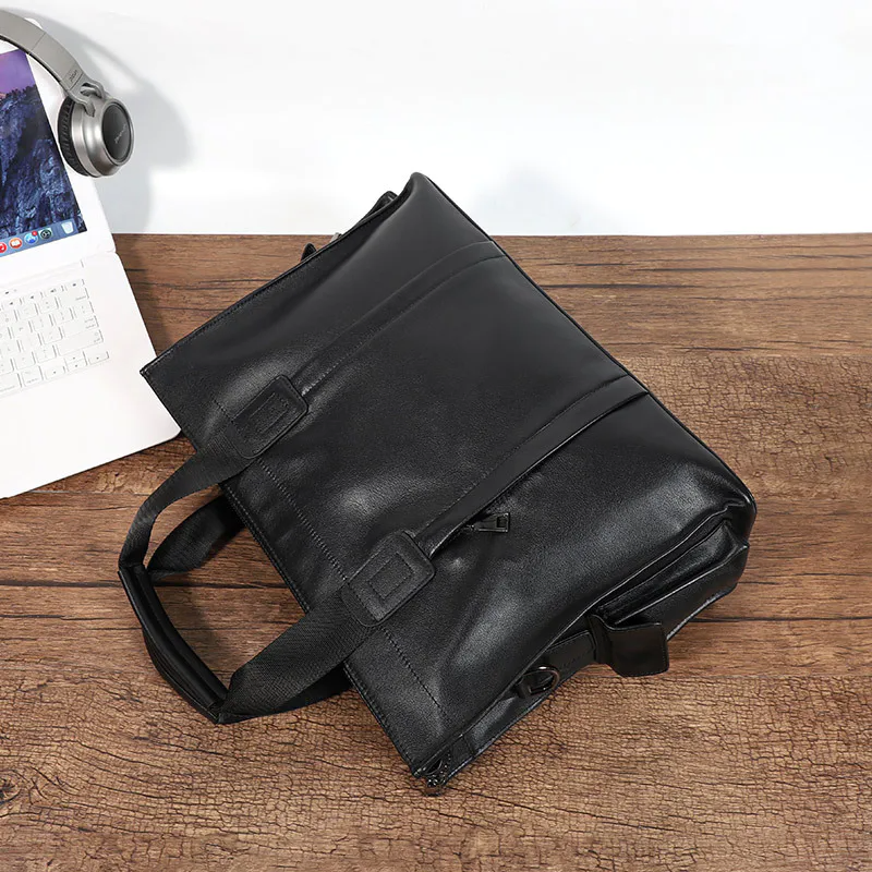 Color: The bag displays a versatile black color that fits a variety of styles.Upper Material: Crafted from genuine leather, the bag offers both sophistication and durability.Number of Shoulder Straps: It comes with a single shoulder strap for ease of use.Opening Method: The zipper closure provides secure access and keeps contents safe.Hardness: The bag features a soft texture, enhancing comfort and flexibility.Shape: This men’s handbag showcases a practical and refined shape.Pattern: Its solid color design ensures a clean and classic appearance.Lining Material: The polyester lining inside the bag adds a layer of protection and smoothness.Features: Equipped with waterproofing, multi-functionality, and a compartment for a 15.6” computer, it caters to various needs.Size: With dimensions of 15.7” x 11.4” x 5.12”, the bag offers ample space in a compact form.Weight: At 1.07 kg, the bag strikes a balance between lightweight and practical.