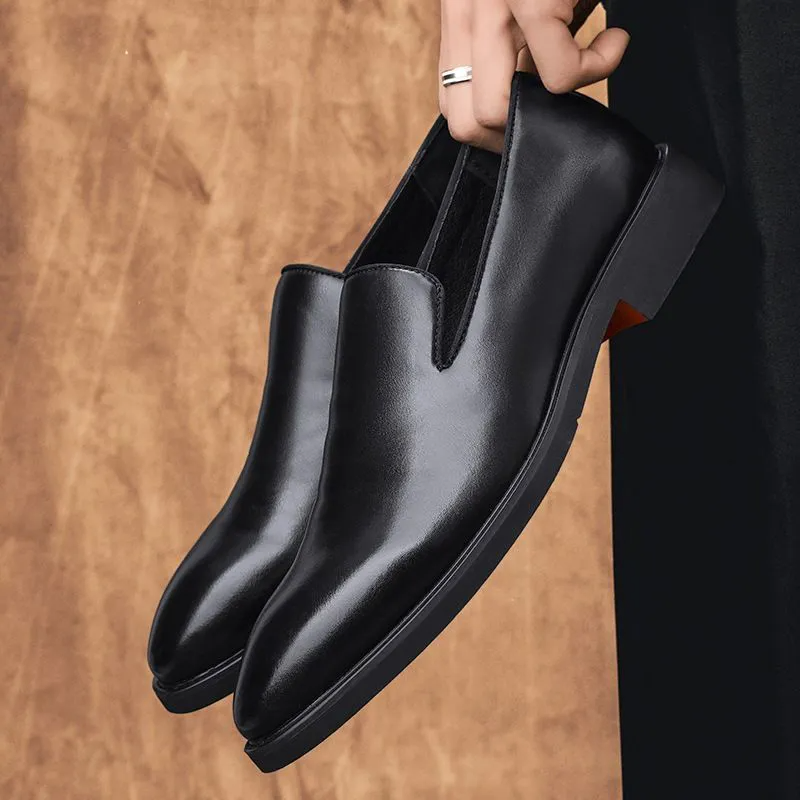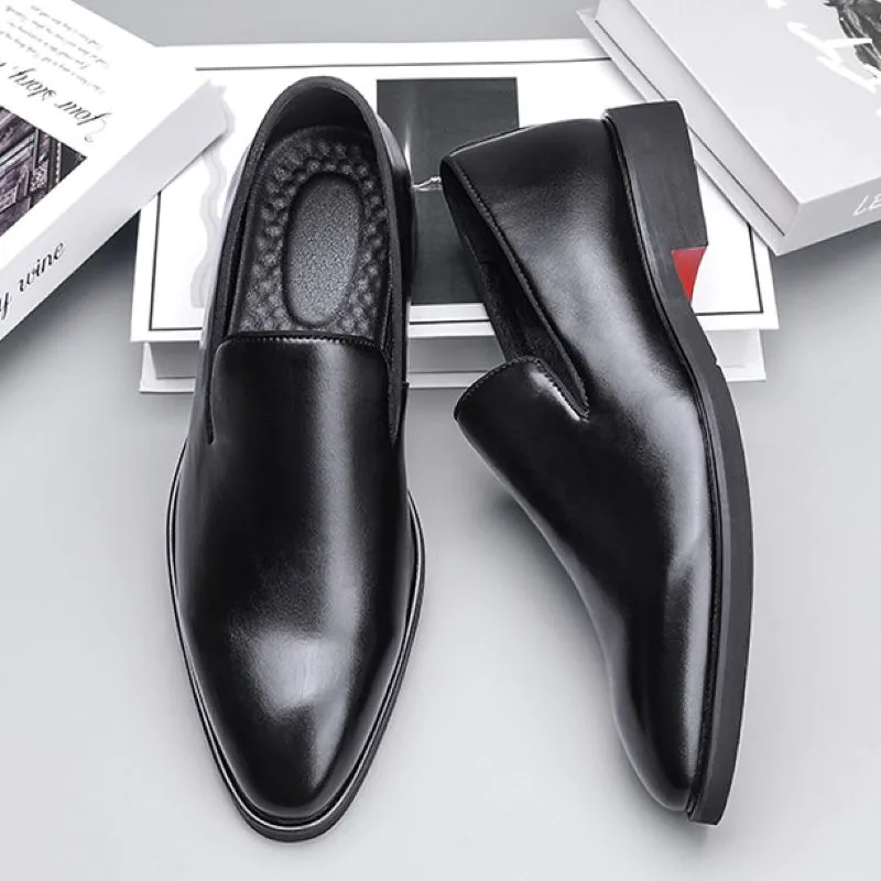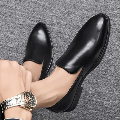 Color: The shoe presents a sleek, jet-black appearance.Upper Material: Crafted from durable microfiber leather for its upper.Outsole Material: Features a sturdy rubber outsole for reliable traction.Insole Material: Incorporates a microfiber leather insole for enhanced comfort.Toe Shape: Designed with a sharp, pointed toe shape for a modern aesthetic.Closure Type: It offers convenient slip-on functionality for ease of wear.Pattern Type: The shoe features a uniform solid color for a sophisticated look.Features: Engineered with breathability, durability, lightweight construction, and superior slip resistance.