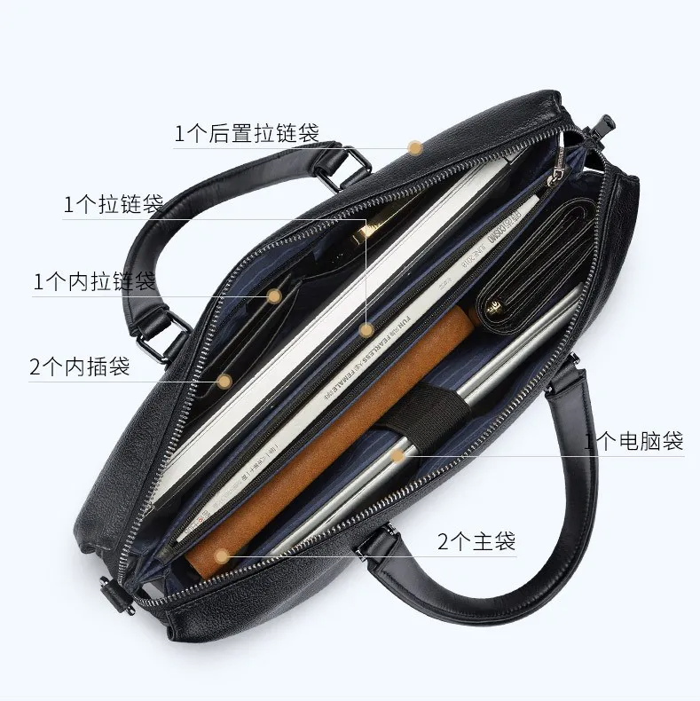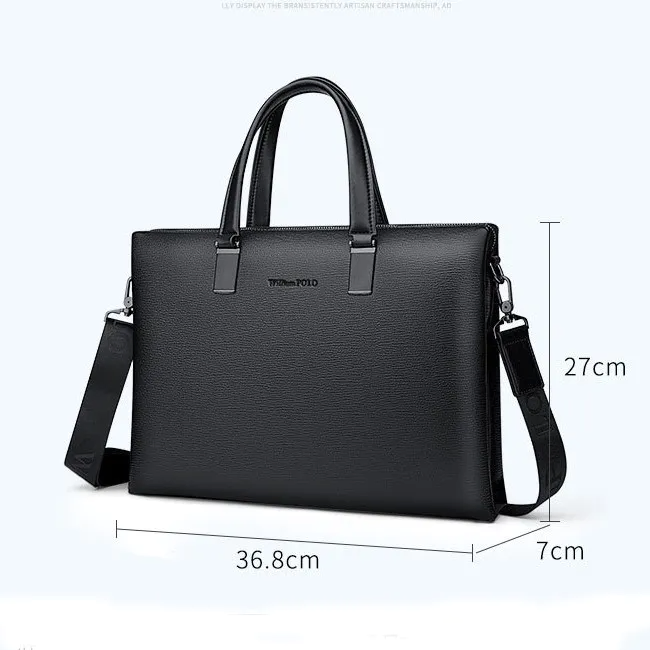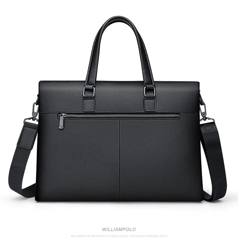 Color: The bag is designed in a classic black, offering a versatile and sleek appearance.Brand: William POLO creates this bag with a reputation for exceptional quality and style.Upper Material: The bag features genuine leather, ensuring a luxurious and long-lasting exterior.Number of Shoulder Straps: It comes with a single shoulder strap, enhancing its practicality for daily use.Opening Method: The bag uses a zipper for a secure and easy way to access its contents.Shape: The handbag shape provides a stylish and functional design for various occasions.Hardness: The soft construction of the bag makes it comfortable to carry and use.Pattern: It presents a solid color pattern, contributing to its timeless and elegant look.Lining Material: Inside, the bag has a polyester lining, which adds to its durability and ease of maintenance.Size: With dimensions of 36.8 cm by 27 cm by 7 cm, the bag offers a balanced blend of compactness and capacity.Features: It provides multi-functionality and includes a 14” computer compartment for added convenience.Weight: Weighing 1 kg, the bag remains lightweight and easy to handle.