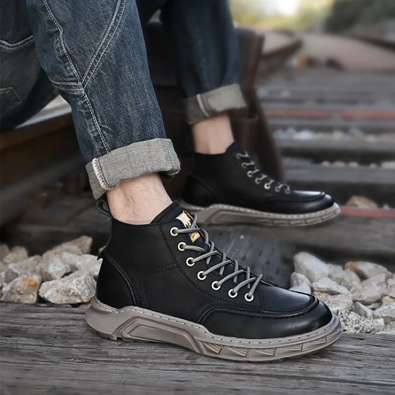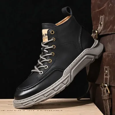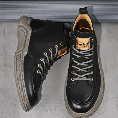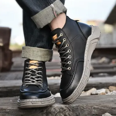 Upper Material: The upper is crafted from genuine C-o-w-h-i-d-e leather, ensuring durability and a premium feel.Outsole Material: The rubber sole provides strong traction and lasting wear.Insole Material: PU leather on the insole delivers cushioned comfort and support.Pattern: A solid pattern gives the boots a timeless and elegant look.Weight: The boots weigh between 860 and 1020 grams, offering a balanced feel.Toe Shape: The round head toe shape ensures ample room and comfort.Closure Type: Lace-up closures allow for a secure and adjustable fit.Features: The boots are designed to be breathable, wear-resistant, lightweight, and equipped with anti-slip properties for reliable performance.