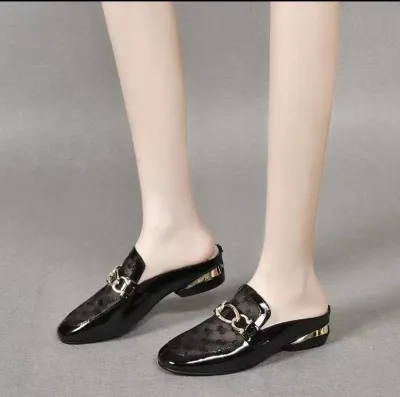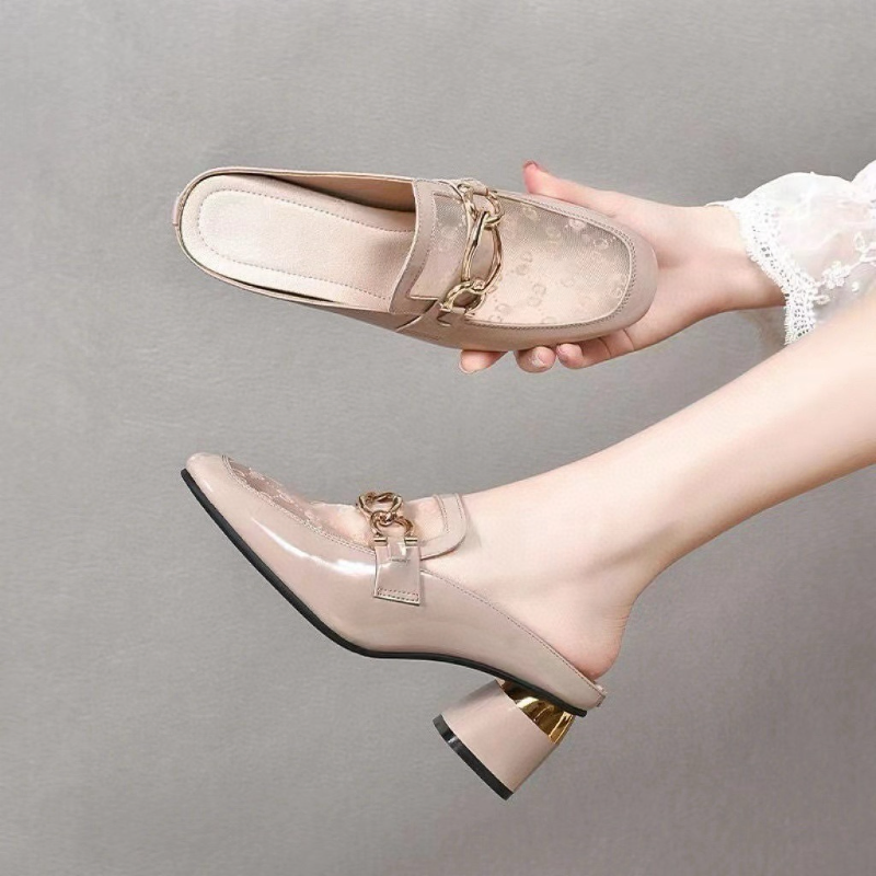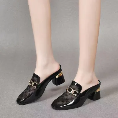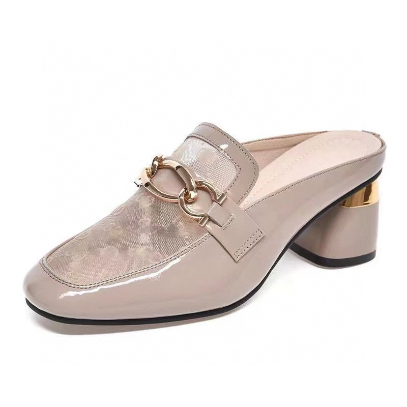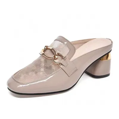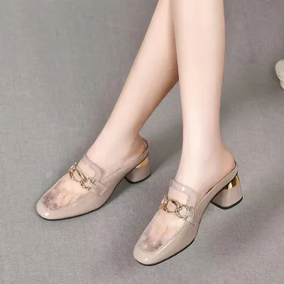 Color: The sandal is offered in classic black and elegant apricot.Upper Material: Genuine C-o-w-h-i-d-e leather provides a luxurious and durable finish.Outsole Material: The rubber sole ensures reliable grip and long-lasting wear.Insole Material: PU leather delivers soft cushioning and comfort.Toe Shape: The round head toe shape offers a comfortable and roomy fit.Closure Type: The slip-on design allows for effortless wearing and removal.Heel Height: The 5 cm heel height provides a stylish lift with enduring comfort.Pattern Type: The solid color pattern offers a clean and versatile look.Features: The sandal features breathability, wear-resistance, a lightweight build, and anti-slip properties for both functionality and style.