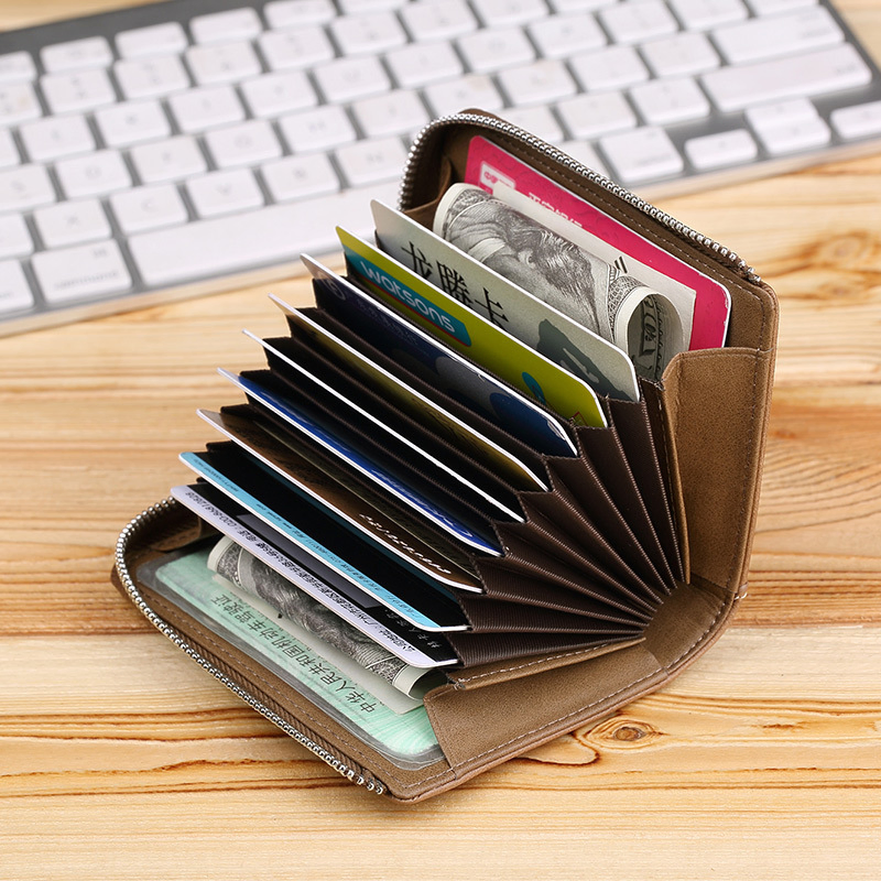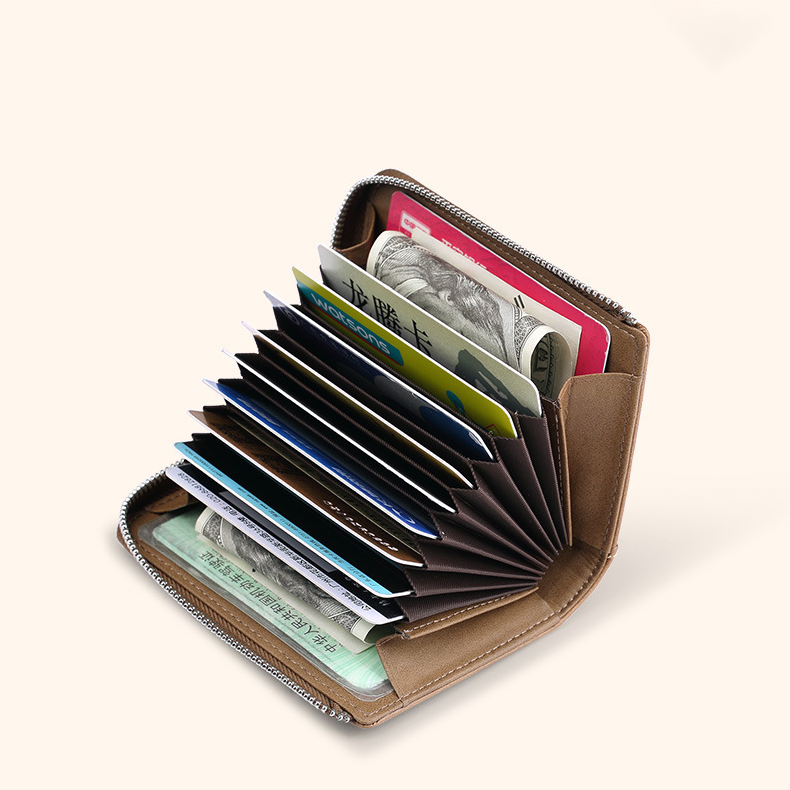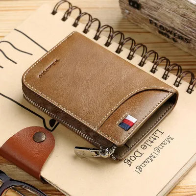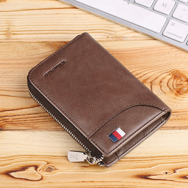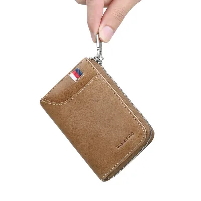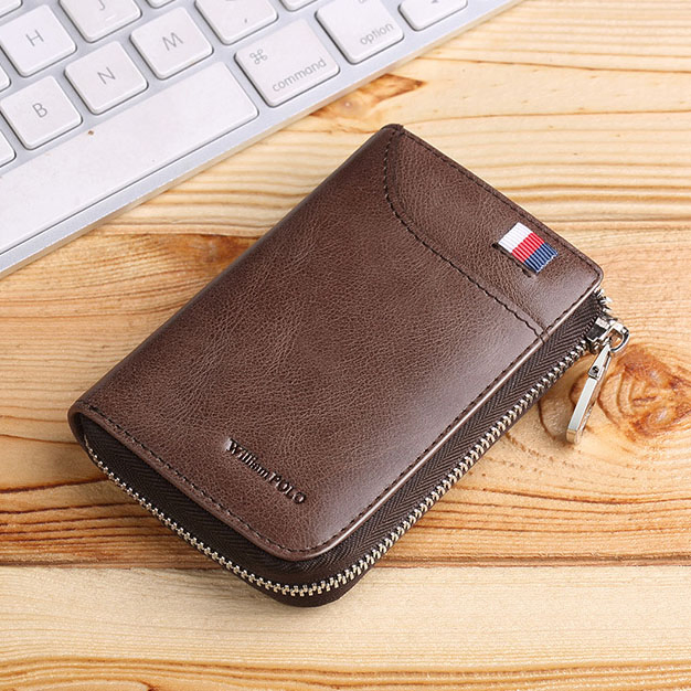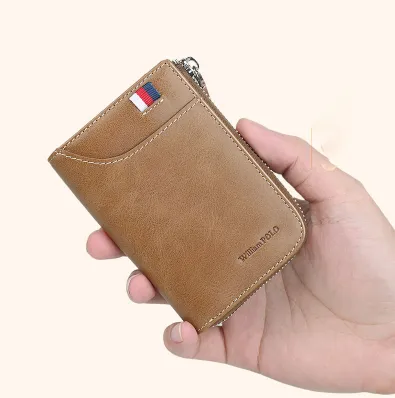 Color: The card holder is available in both dark brown and light brown shades.Brand: William Polo offers this card holder with a commitment to premium quality and style.Upper Material: Genuine leather serves as the elegant and durable exterior.Opening Method: A secure zipper provides reliable closure and easy access.Folding: The card holder features a two-fold design for efficient organization.Lining: Polyester lining ensures a smooth and lasting interior.Pattern: The card holder maintains a solid color pattern for a refined look.Size: Measuring 4.25" in height, 2.95" in length, and 0.94" in width, it offers a compact and functional size.Weight: The card holder weighs 350 grams, giving it a substantial and sturdy feel.