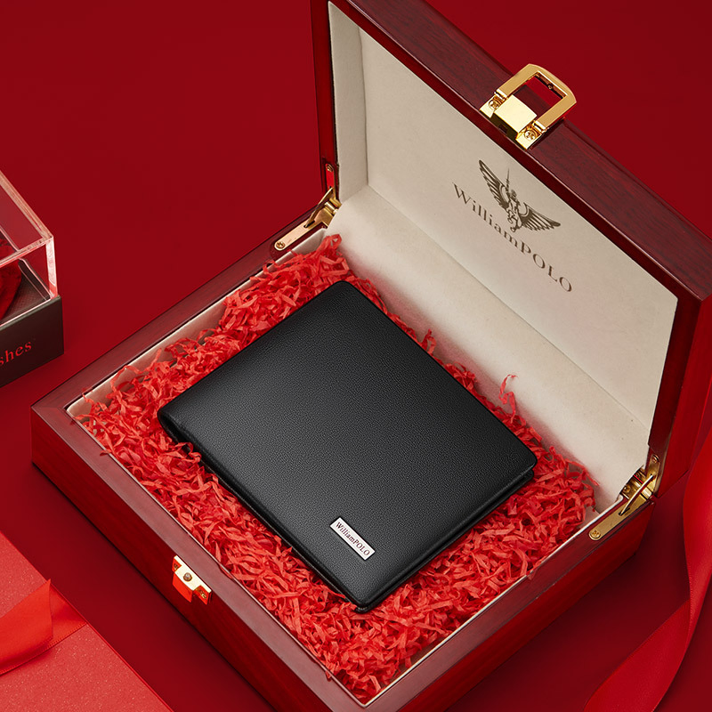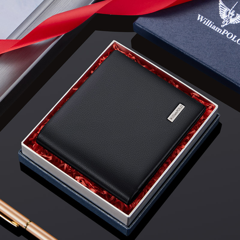 Color: The wallet comes in a bold black, giving it a timeless and elegant appearance.Brand: Designed by William POLO, this wallet reflects the brand's dedication to style and quality.Upper Material: Made from genuine leather, it offers both durability and a luxurious feel.Folding: Its 2-fold structure ensures easy organization and a compact design.Pattern: The solid color adds a minimalist touch, making it versatile for any occasion.Hardness: The soft texture of the wallet ensures a comfortable and flexible experience.Length: Measuring 4.56 inches, it provides a compact yet functional size for daily essentials.Width: With a width of 3.81 inches, the wallet fits perfectly in pockets without being bulky.