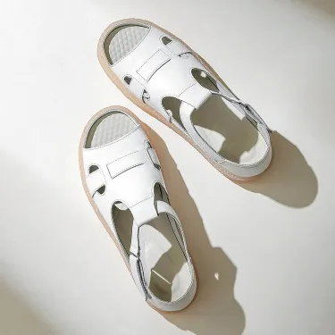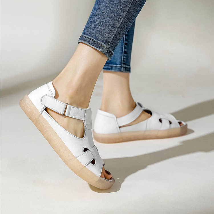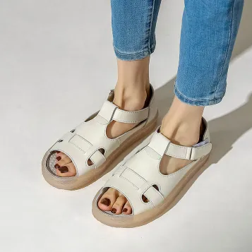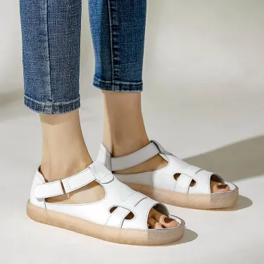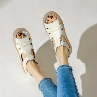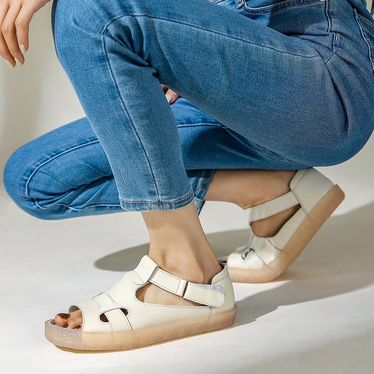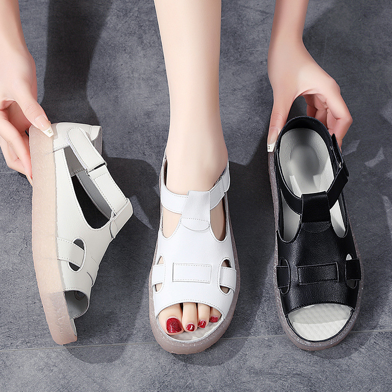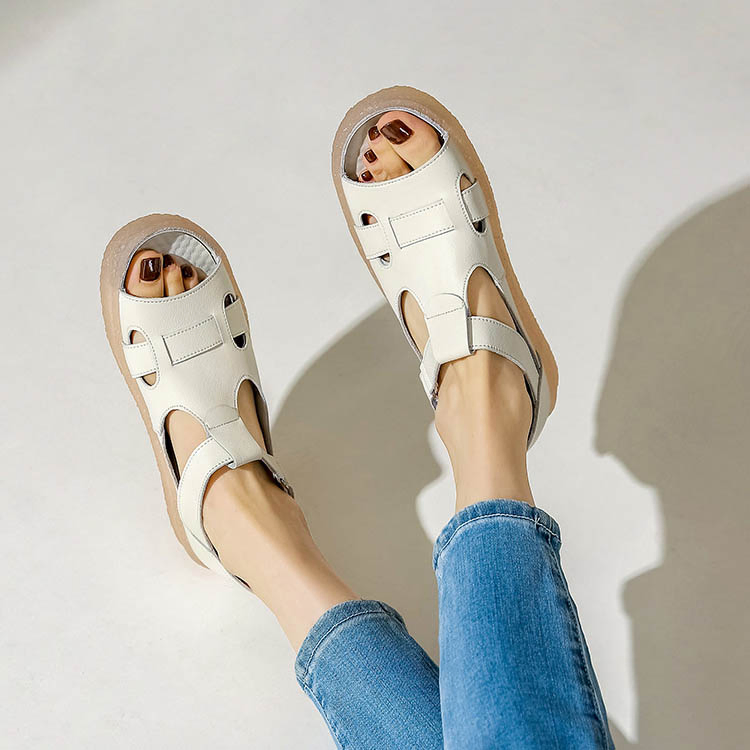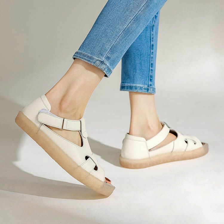 Color: The sandal is offered in neutral beige, classic black and white.Upper Material: Genuine leather provides a luxurious and durable finish.Outsole Material: The TPR sole ensures flexible support and reliable grip.Insole Material: PU leather delivers cushioned comfort for all-day wear.Toe Shape: The round head toe shape offers a comfortable and accommodating fit.Closure Type: The Velcro closure allows for easy adjustability and secure fit.Heel Height: The 2 cm heel height provides a subtle lift while ensuring comfort.Pattern Type: The solid color pattern delivers a clean and versatile look.Features: The sandal features breathability, wear-resistance, a lightweight design, and anti-slip properties for both practicality and style.