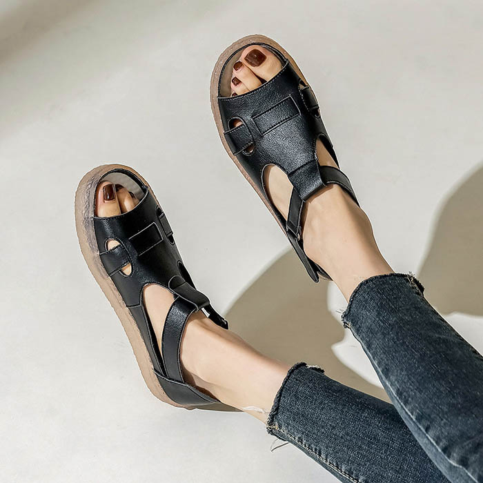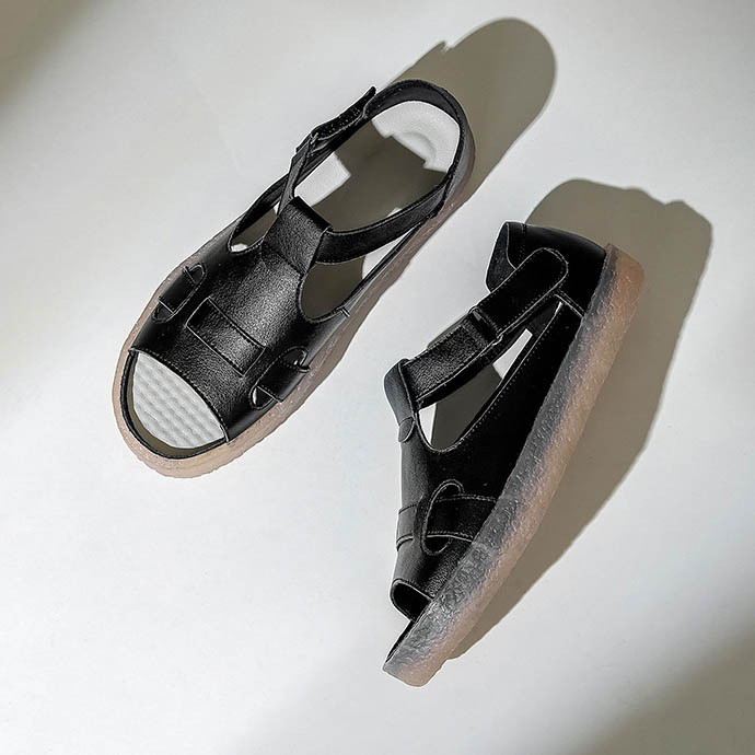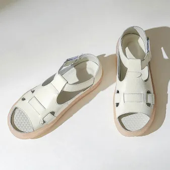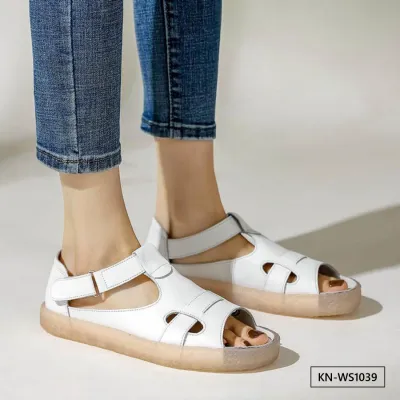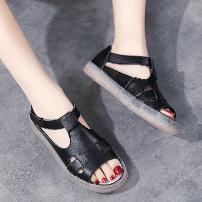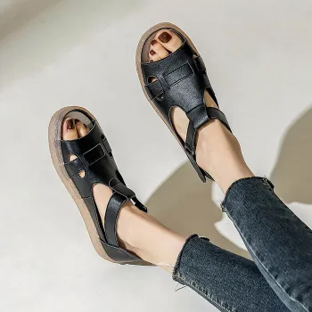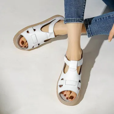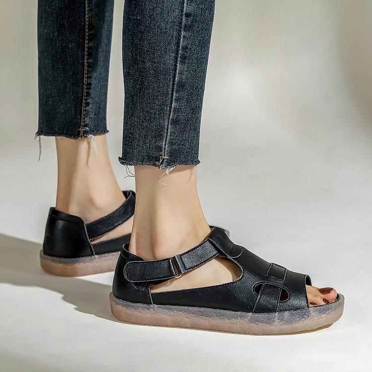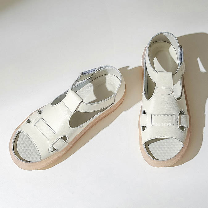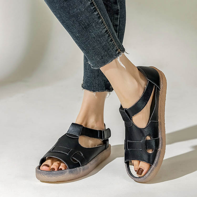 Color: The sandal is offered in neutral beige, classic black and white.Upper Material: Genuine leather provides a luxurious and durable finish.Outsole Material: The TPR sole ensures flexible support and reliable grip.Insole Material: PU leather delivers cushioned comfort for all-day wear.Toe Shape: The round head toe shape offers a comfortable and accommodating fit.Closure Type: The Velcro closure allows for easy adjustability and secure fit.Heel Height: The 2 cm heel height provides a subtle lift while ensuring comfort.Pattern Type: The solid color pattern delivers a clean and versatile look.Features: The sandal features breathability, wear-resistance, a lightweight design, and anti-slip properties for both practicality and style.