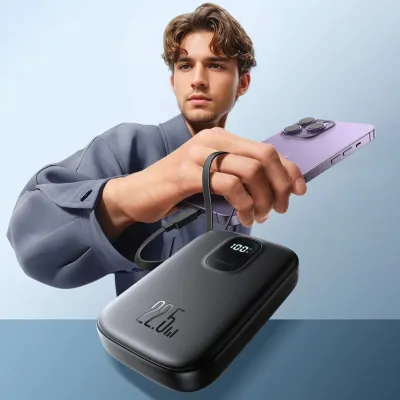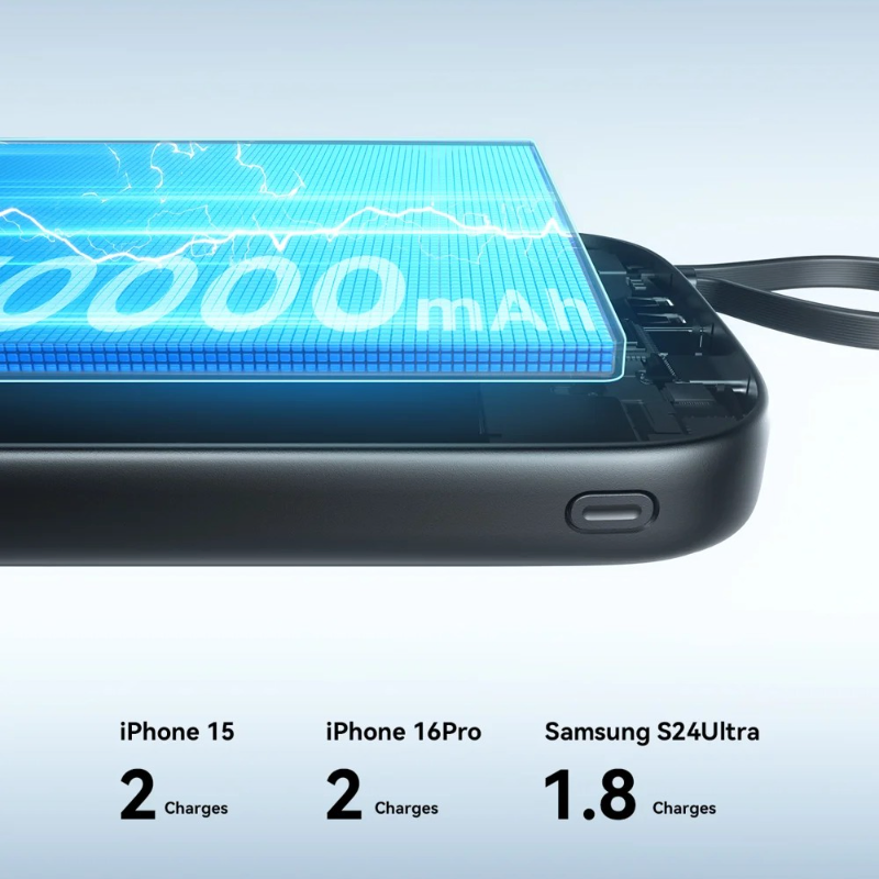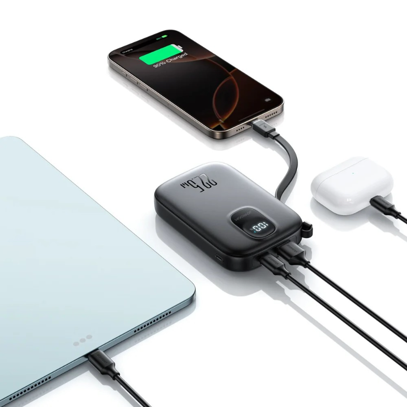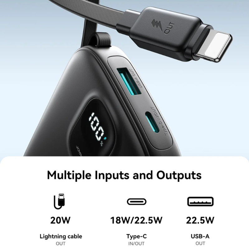 Output Ports: USB-A, USB-C, and integrated Lightning cable.