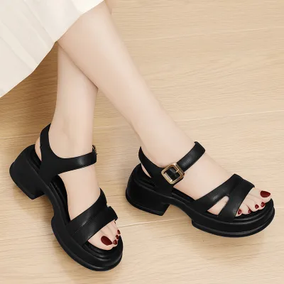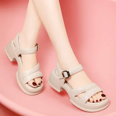 Color: Available in black and beige.Upper Material: Genuine leather for a premium and durable finish.Outsole Material: PU foam sole, known for its cushioning and lightweight properties.Insole Material: PU leather, providing comfort and support.Toe Shape: Open toe design for ventilation and ease of wear.Closure Type: Velcro for adjustable and secure fastening.Heel Height: 5.5 cm for a stylish lift without compromising comfort.Pattern Type: Solid color for a versatile and classic look.Features: Breathable, wear-resistant, lightweight, and anti-slip, ensuring comfort and stability throughout wear.