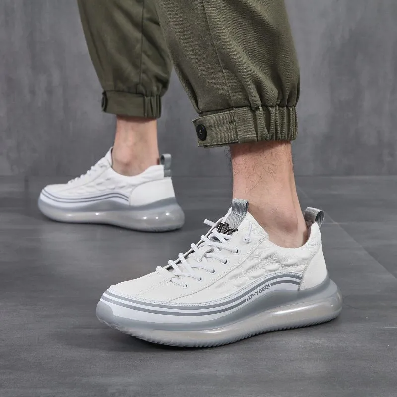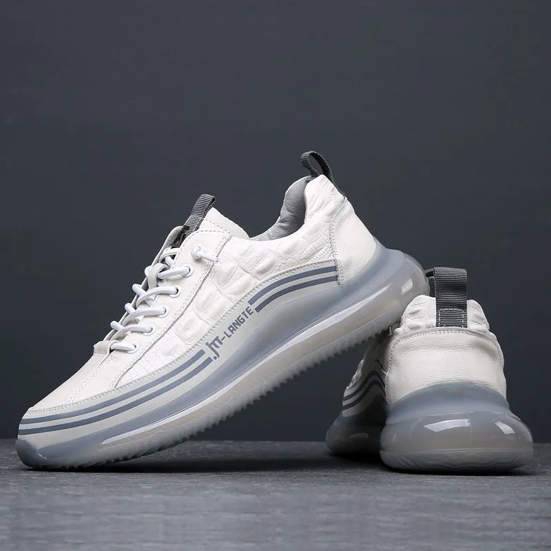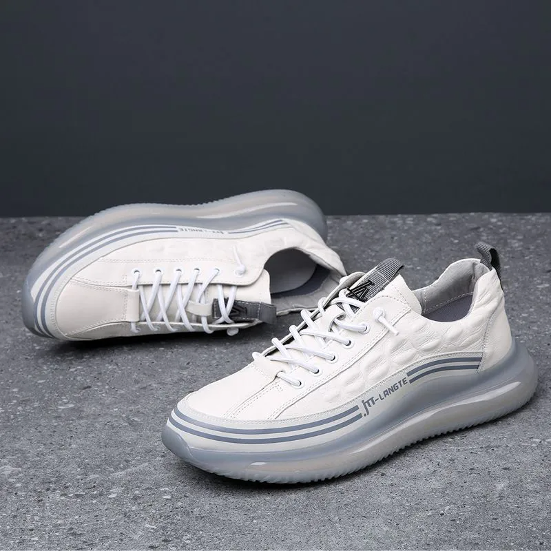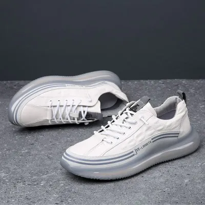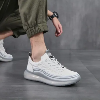 Color: The shoe is styled in pristine white, offering a clean and versatile aesthetic.Upper Material: Crafted from genuine leather, ensuring durability and a premium look.Outsole Material: Features a rubber sole for reliable traction and durability.Toe Shape: Designed with a round head toe shape for enhanced comfort and fit.Closure Type: Secures with a lace-up closure for a snug and adjustable fit.Features: Provides breathability, wear resistance, lightweight comfort, and anti-slip properties, ensuring stability and comfort in various conditions.Weight: Weighs between 780 to 900 grams, balancing durability with a solid feel suitable for daily wear.