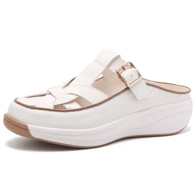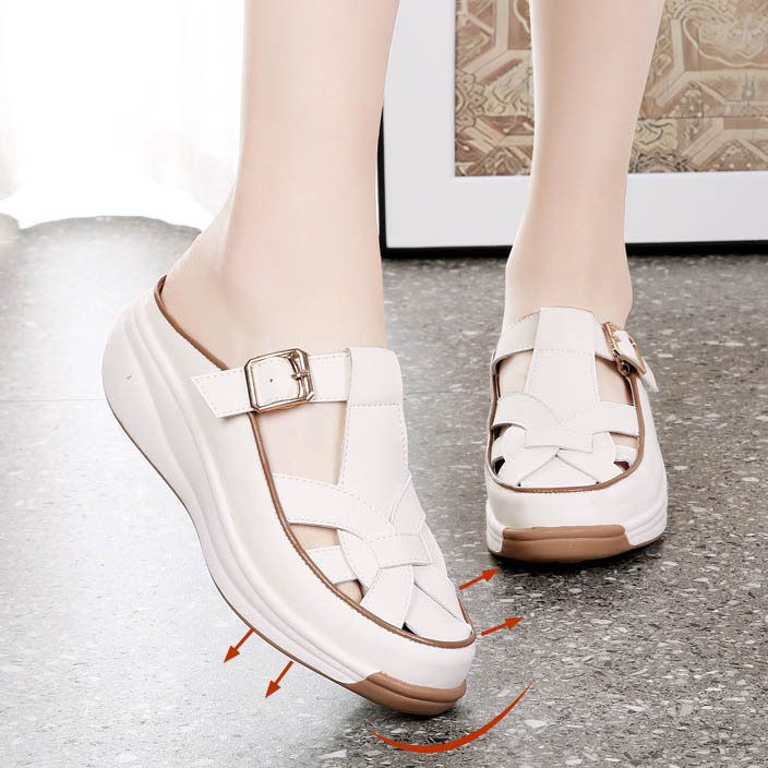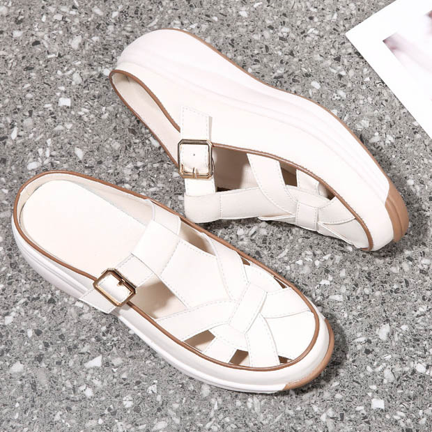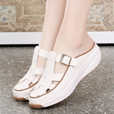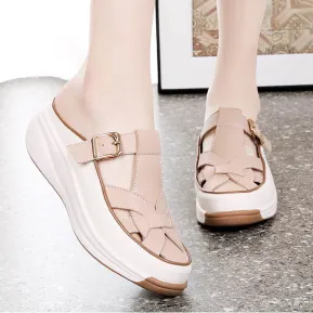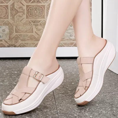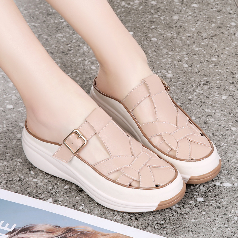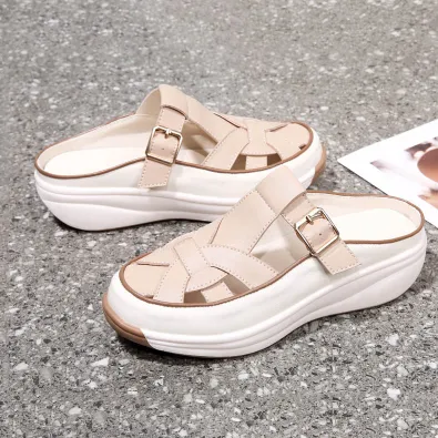 Color: The sandal is available in soft beige and warm rice brown.Upper Material: PU leather offers a smooth and durable finish.Outsole Material: The PU sole ensures lightweight support and reliable grip.Insole Material: PU leather provides cushioned comfort for extended wear.Toe Shape: The round head toe shape delivers a comfortable and spacious fit.Closure Type: The slip-on design allows for easy and convenient wear.Heel Height: The 4 cm heel height adds a stylish lift with enduring comfort.Pattern Type: The solid color pattern presents a clean and classic look.Features: The sandal features breathability, wear-resistance, a lightweight build, and anti-slip properties for practical and fashionable use.