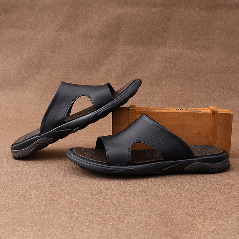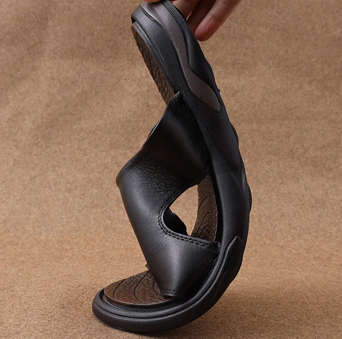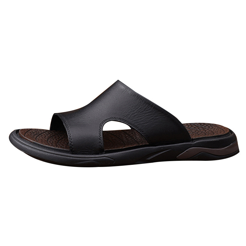 Color: This shoe comes in black.Upper Material: It is crafted from genuine C-o-w-h-i-d-e leather, ensuring quality and durability.Outsole Material: The sole is made of rubber, providing durability and traction.Toe Shape: Featuring an open-toe design, it enhances comfort and breathability.Closure Type: It allows for easy wearing with slip-on functionality.Pattern Type: The shoe features a solid pattern, maintaining a sleek and timeless aesthetic.Features: It is designed to be breathable, resistant to wear, lightweight for comfort, and equipped with anti-slip properties for safety.