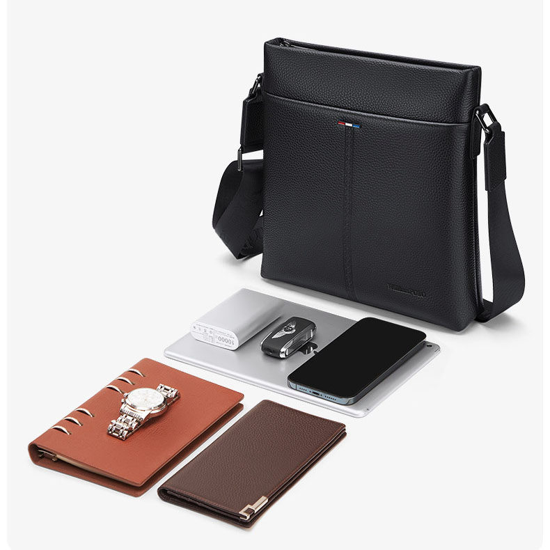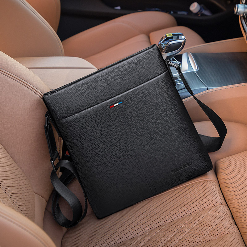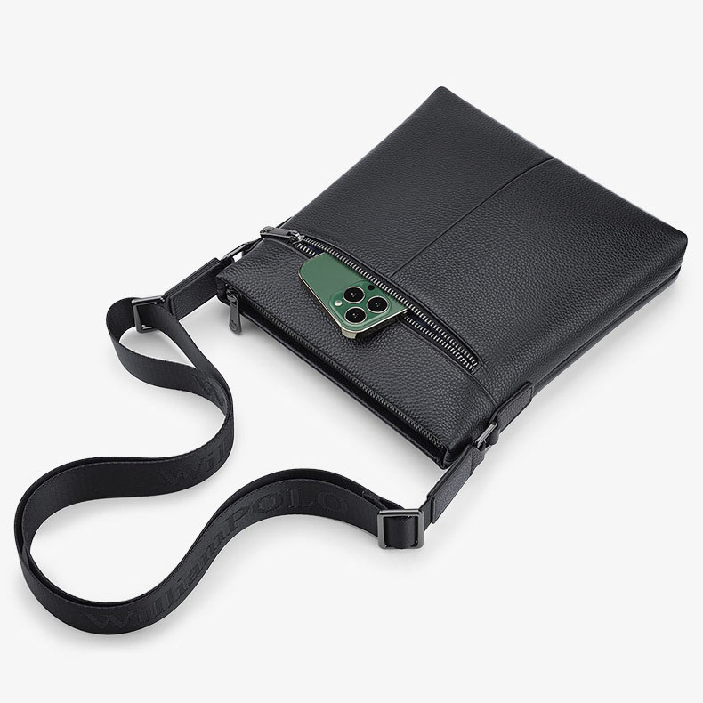 Color: The bag boasts a sleek black color for a classic look.Upper Material: It is crafted from genuine leather, ensuring both style and durability.Opening Method: The zipper closure allows for secure and easy access.Pattern: The bag sports a straightforward solid pattern.Lining Material: Polyester lining enhances the bag’s interior with smoothness and durability.Features: The design incorporates wear-resistant and shock-resistant qualities for added protection.Accommodated Mobile/Tab Size: The bag can hold devices up to 8 ” in size.Size: Measuring 10.43 ” in height, 9.64 ” in length, and 1.96 ” in width, it offers a compact yet functional size.Weight: With a weight of 400 grams, the bag balances lightweight portability with robustness.
