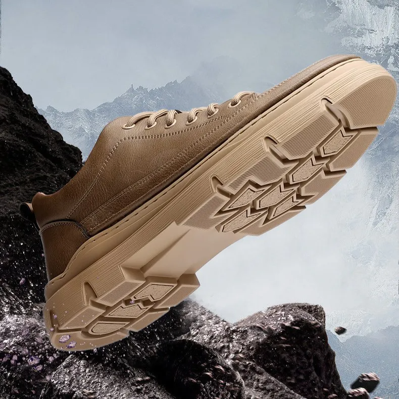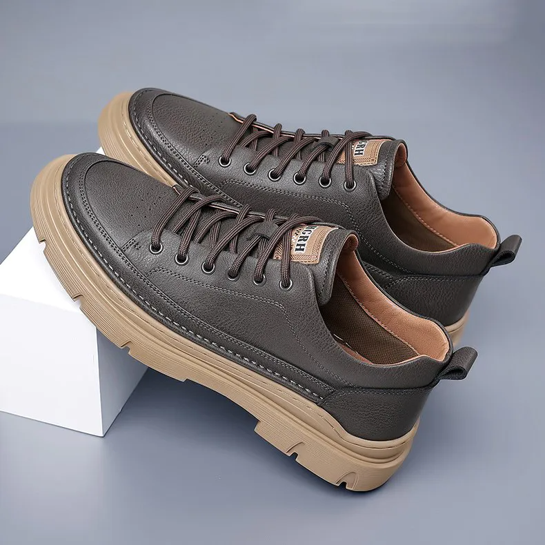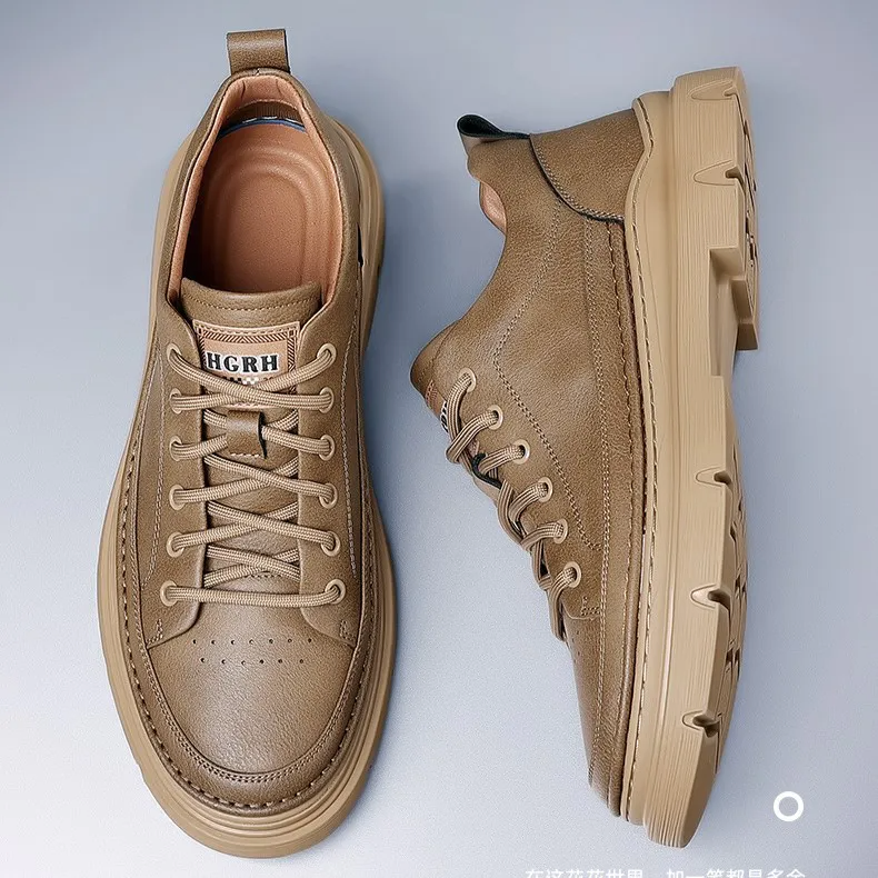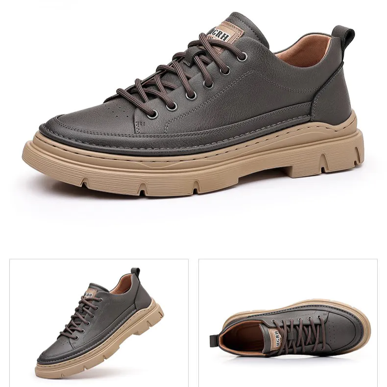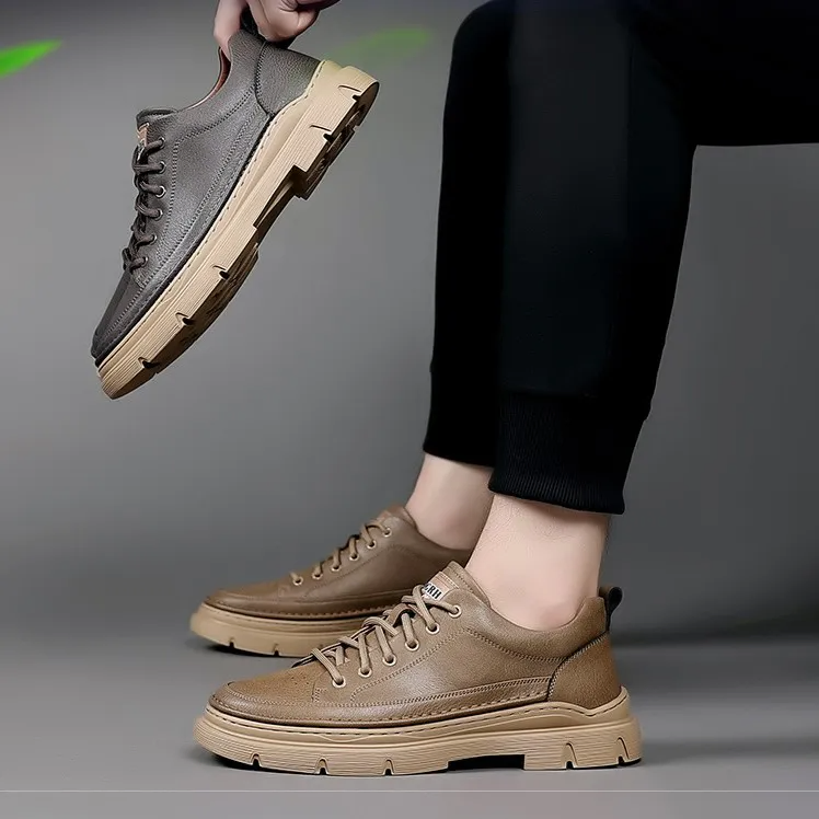 Color: The shoe comes in stylish khaki and sophisticated grey options.Upper Material: Genuine leather constructs the shoe's upper, ensuring durability and a classic appearance.Outsole Material: The rubber sole provides reliable traction and durability.Insole Material: PU leather lines the insole, offering comfort and support throughout wear.Toe Shape: Designed with a round head toe shape, the shoe prioritizes comfort and natural foot movement.Closure Type: It features a lace-up closure for a secure and adjustable fit.Pattern Type: Displaying a solid pattern, the shoe maintains a clean and timeless design.Features: Engineered for breathability, wear-resistance, lightweight feel, and anti-slip properties, suitable for various activities and everyday use.