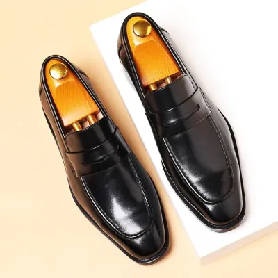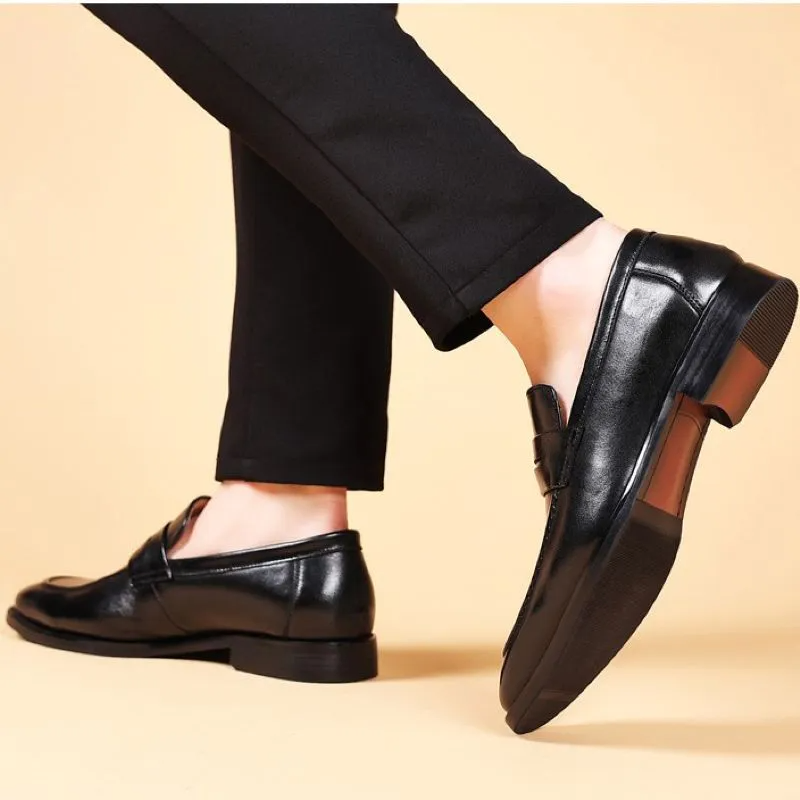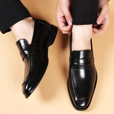 Color: The shoe flaunts a sleek, ebony black shade.Upper Material: It employs premium top layer C-o-w-h-i-d-e leather for the upper.Outsole Material: The outsole integrates a robust rubber sole for reliable traction.Insole Material: Featuring a comfortable PU leather insole for enhanced cushioning.Toe Shape: Designed with a rounded head toe shape for optimal comfort.Closure Type: It offers effortless slip-on functionality for quick and easy wear.Pattern Type: The shoe presents a sleek and timeless solid design.Features: Engineered to provide breathability, durability, lightweight feel, and exceptional slip resistance.