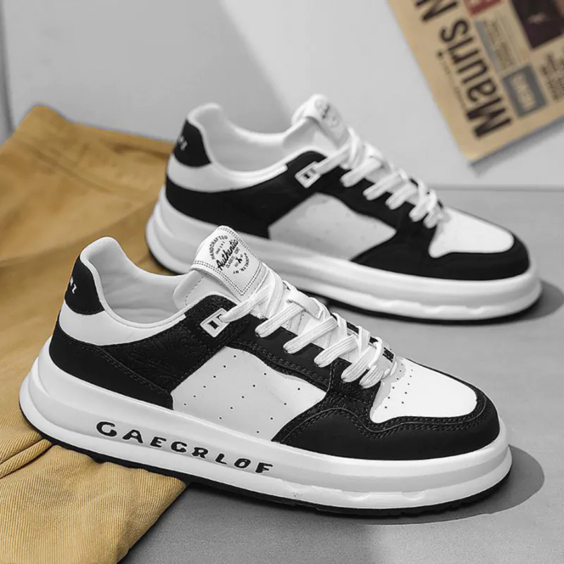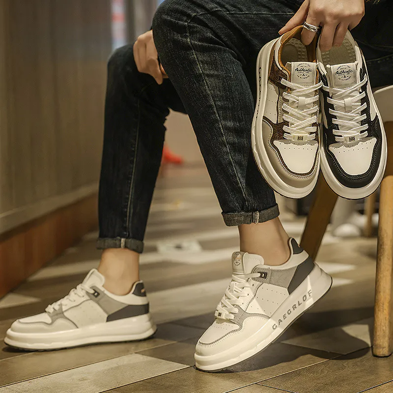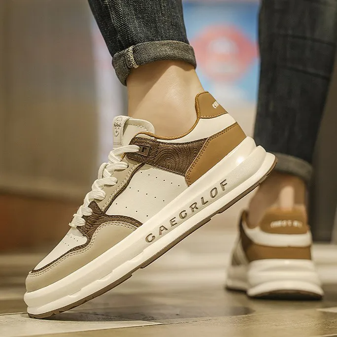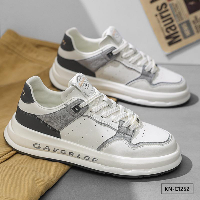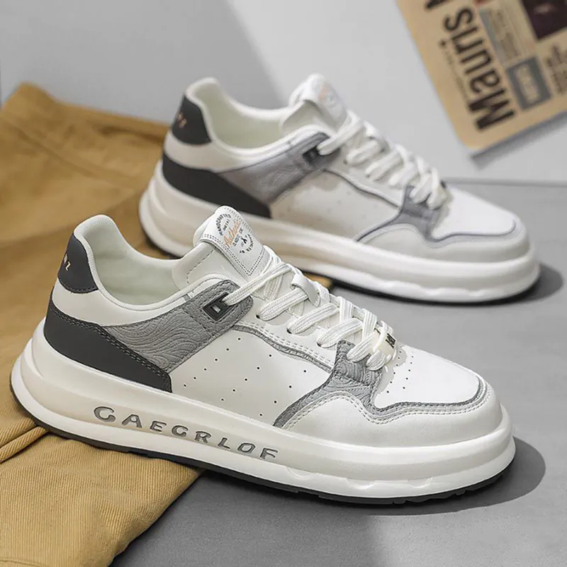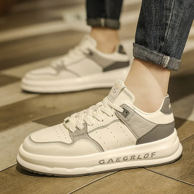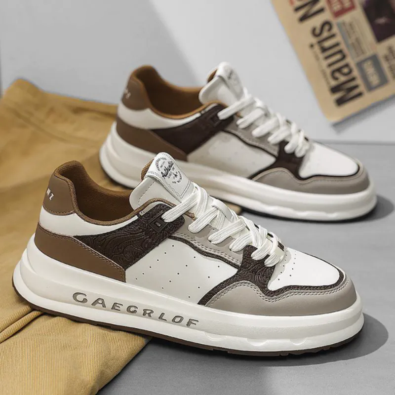 Color: The shoe combines shades of white, black, rice brown, and beige.Upper Material: Microfiber leather serves as the upper material of the shoe.Outsole Material: The outsole is constructed with rubber for enhanced durability.Insole Material: EVA provides cushioning and comfort as the insole material.Toe Shape: It features a round head toe shape.Closure Type: The shoe utilizes a lace-up closure for a secure fit.Pattern Type: The design showcases a solid pattern throughout.Features: The shoe is breathable, wear-resistant, lightweight, and equipped with anti-slip properties.