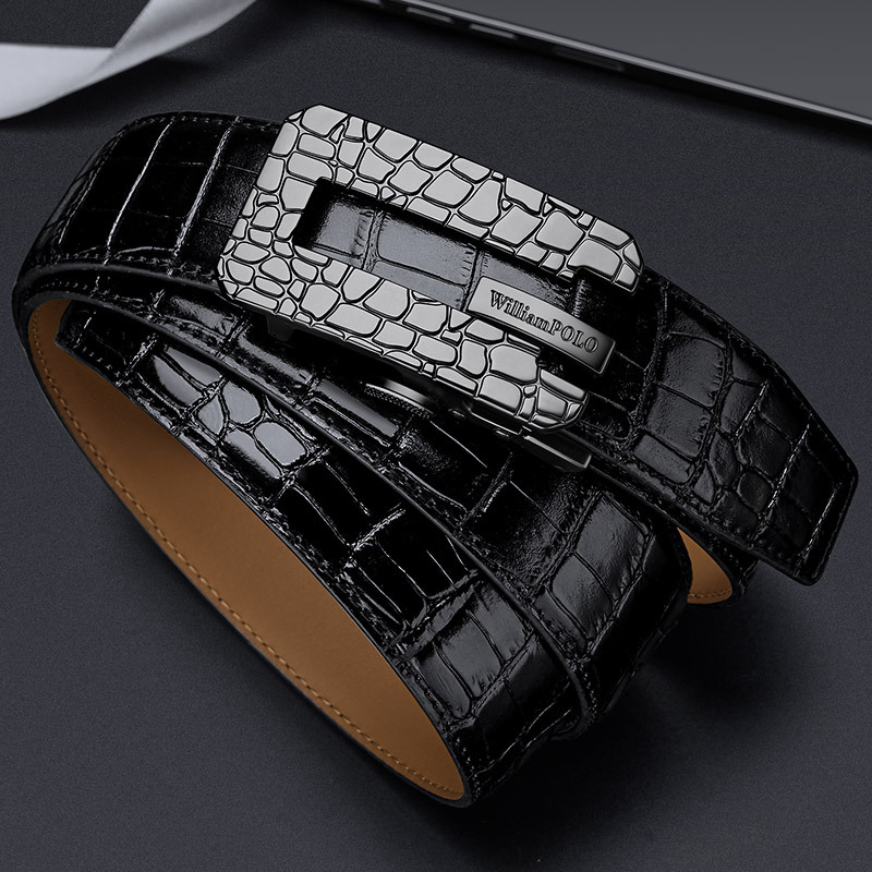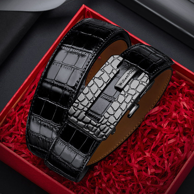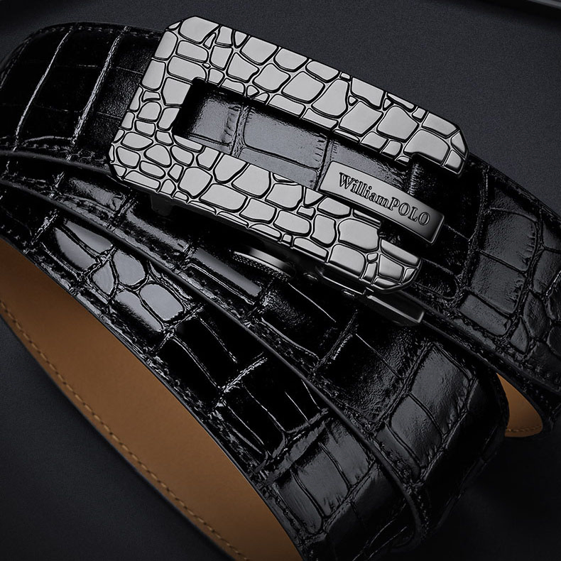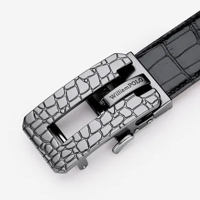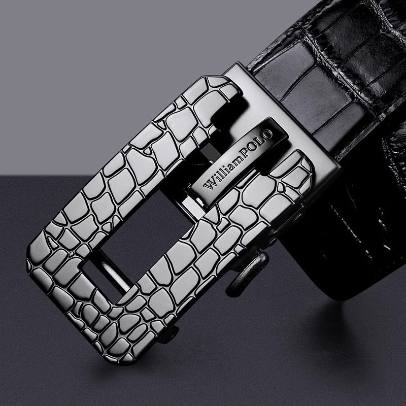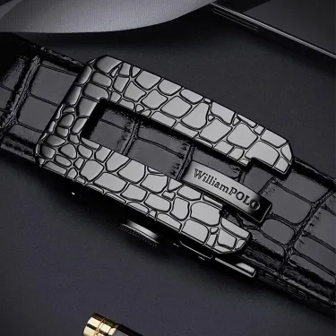 Buckle Color: The buckle features a striking combination of gunmetal, gold, and silver colors.Belt Color: The belt is designed in a classic black shade for timeless style.Brand: William POLO delivers this belt with a commitment to quality and elegance.Upper Material: Genuine leather ensures both a luxurious feel and long-lasting durability.Fastening Method: The automatic buckle provides a quick and secure fastening mechanism.Lining: The belt includes a polyester lining for added comfort and resilience.Pattern: The belt’s solid color design contributes to a sleek and versatile look.Length: Measuring 120 ”, the belt fits a wide range of waist sizes comfortably.Width: With a width of 3.8 ”, the belt maintains a stylish and practical profile.Weight: The belt weighs 350 grams, offering a substantial yet comfortable feel.