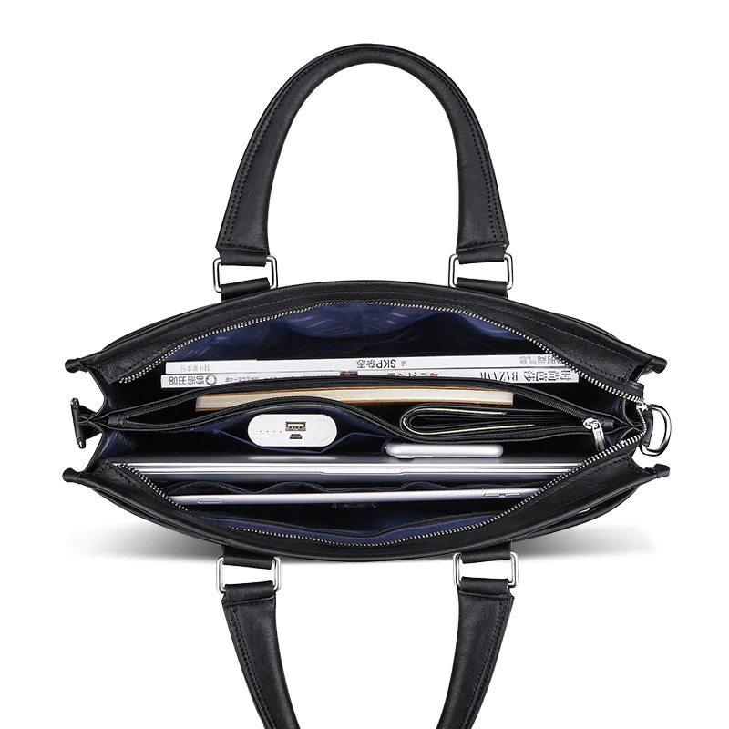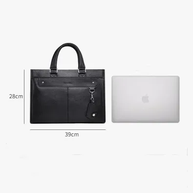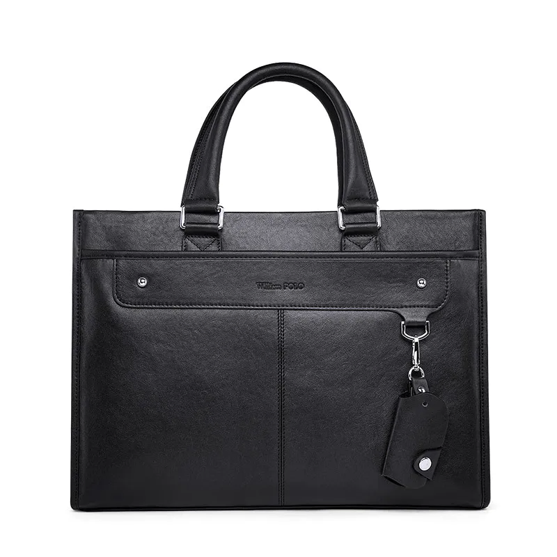 Color: The bag features a sleek black color that adds a touch of elegance to any outfit.Brand: William POLO crafts this bag with a commitment to premium quality and design.Upper Material: It is made from genuine leather, providing a sophisticated and durable finish.Number of Shoulder Straps: The bag includes a single shoulder strap, making it easy to carry.Opening Method: A zipper ensures that the bag opens and closes securely and smoothly.Shape: The handbag shape offers a classic and practical style for various uses.Hardness: The bag’s soft structure ensures a comfortable and flexible carrying experience.Pattern: The solid color pattern enhances its timeless and versatile appeal.Lining Material: The interior is lined with polyester, contributing to both durability and easy upkeep.Size: Measuring 39 cm by 28 cm by 8 cm, the bag provides ample space while remaining compact.Features: It boasts multi-functionality and a 13” computer compartment for versatile use.Weight: At just 1 kg, the bag is lightweight and convenient to carry.
