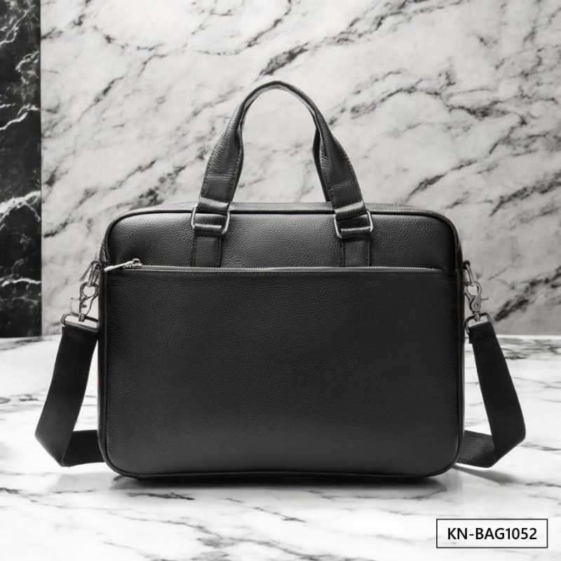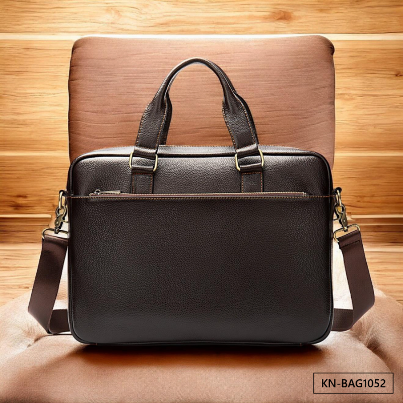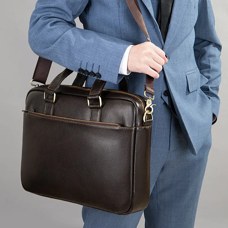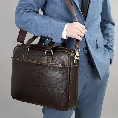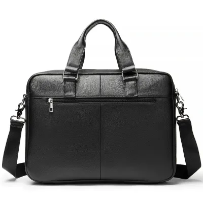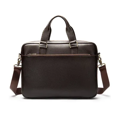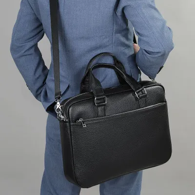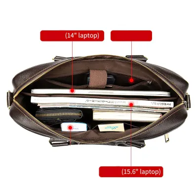Color: The bag is available in classic black and rich brown shades.Upper Material: It is constructed from premium genuine leather.Number of Shoulder Straps: The bag features a single shoulder strap.Opening Method: It closes securely with a zipper.Hardness: The bag offers a soft and pliable feel.Shape: The bag is styled as a men’s handbag.Pattern: It showcases a sleek, solid color.Lining Material: The interior is lined with durable polyester cotton.Features: This bag is waterproof, multifunctional, wear-resistant, and fits a 15-inch computer.Size: Its dimensions are 15.36 inches in length, 11.42 inches in height, and 3.15 inches in depth.Weight: The bag weighs 1.09 kilograms for a balanced and easy carry.
