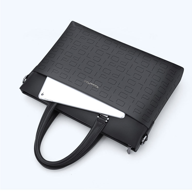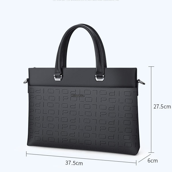 Color: The bag comes in a sleek black color, perfect for a sophisticated look.Brand: William POLO designs this bag with a focus on modern style and high-quality materials.Upper Material: It features PVC on the upper, offering a durable and stylish exterior.Number of Shoulder Straps: The bag has a single shoulder strap for easy and comfortable carrying.Opening Method: A zipper provides secure closure and quick access to the contents.Hardness: The bag’s soft construction ensures a comfortable and flexible use.Shape: The handbag shape adds a classic and practical touch to its design.Pattern: It boasts a solid color pattern, which enhances its timeless and versatile appeal.Lining Material: The polyester lining adds durability and facilitates easy cleaning.Size: With dimensions of 14.76" (L) x 10.82" (H) x 2.36" (W), the bag offers a compact yet functional size.Features: It includes multi-functionality and a 14" computer compartment for added practicality.Weight: Weighing 1 kg, the bag remains light and easy to handle.