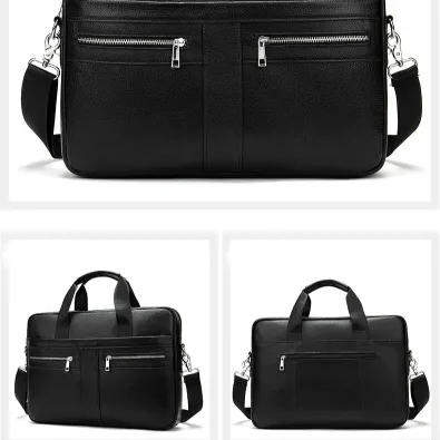 Color: The bag is presented in a sleek and versatile black.Upper Material: It is made from high-quality genuine leather.Number of Shoulder Straps: The bag includes a single shoulder strap.Opening Method: It features a secure zipper closure.Hardness: The bag offers a soft and flexible texture.Shape: It is designed as a men’s handbag.Pattern: It boasts a simple, solid color pattern.Lining Material: The interior is lined with comfortable polyester cotton.Features: The bag is waterproof, multifunctional, wear-resistant, and accommodates a 14-inch computer.Size: The dimensions are 14.96 inches by 10.63 inches by 2.75 inches.Weight: The bag weighs 1 kilogram, making it easy to carry.