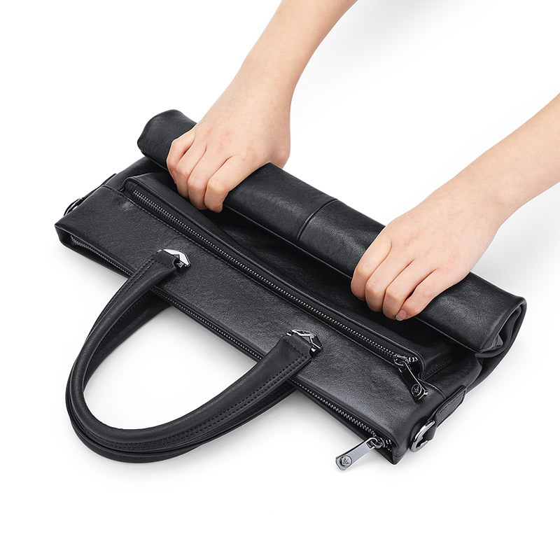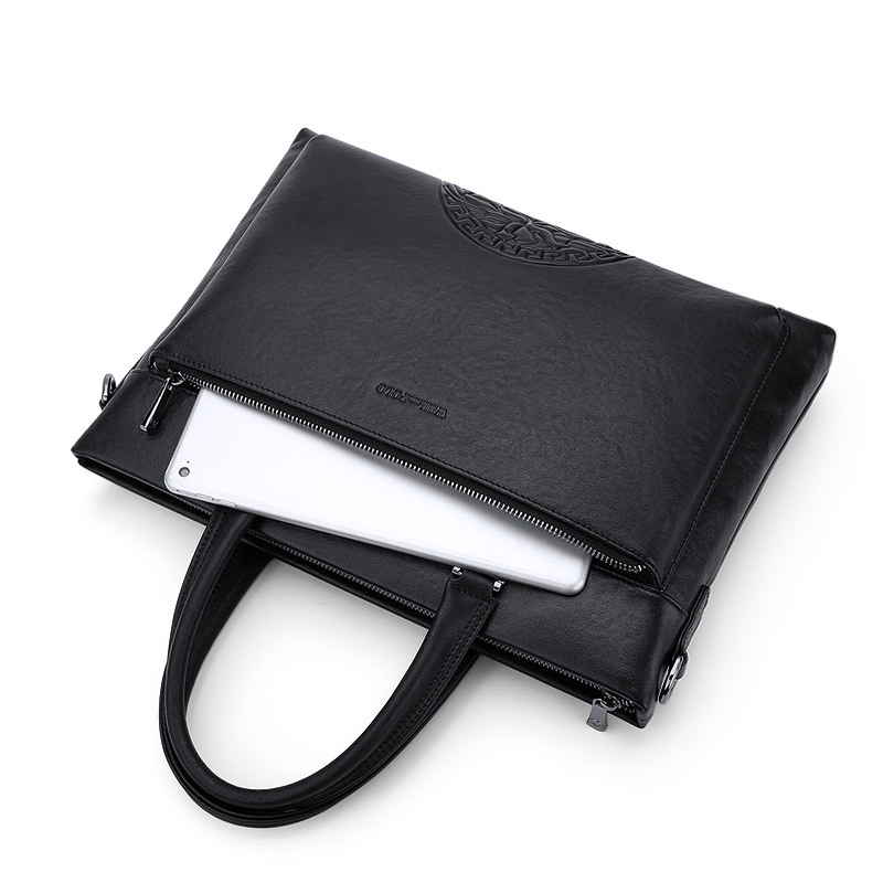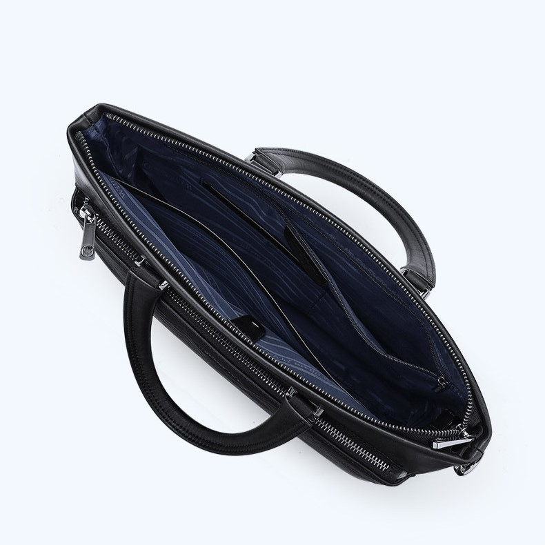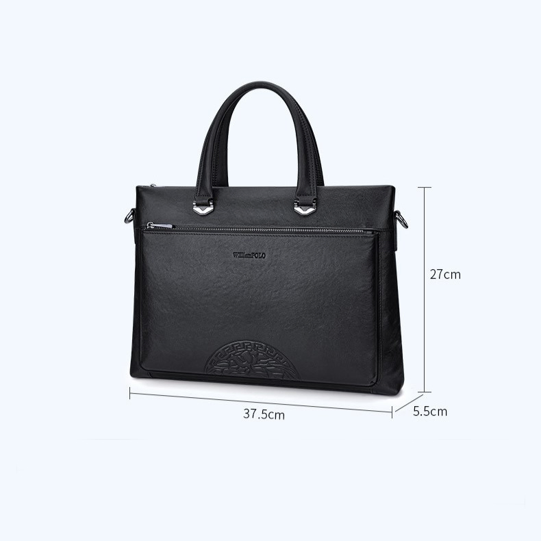 Color: The bag comes in black, providing a sophisticated and versatile color choice.Brand: William POLO designs this bag, reflecting a commitment to high standards of quality.Upper Material: The upper material is genuine C-o-w-h-i-d-e leather, known for its durability and luxurious feel.Number of Shoulder Straps: It has a single shoulder strap, making it easy to carry.Opening Method: A zipper ensures secure closure and convenient access to the contents.Hardness: The bag features a soft hardness, enhancing its comfortable and flexible nature.Shape: The bag is fashioned as a handbag, offering both style and practicality.Pattern: It showcases a solid color pattern, giving it a clean and timeless look.Lining Material: The polyester lining inside contributes to the bag’s strength and ease of maintenance.Size: With dimensions of 14.76" (L) x 10.62" (H) x 2.16" (W), the bag provides ample room for essentials.Features: This bag is multi-functional, includes a 14" computer compartment, and offers waterproof protection.Weight: Weighing 1 kg, the bag remains light enough for everyday use while being sturdy.