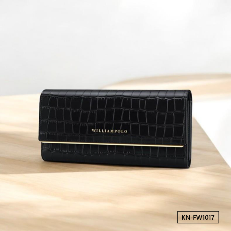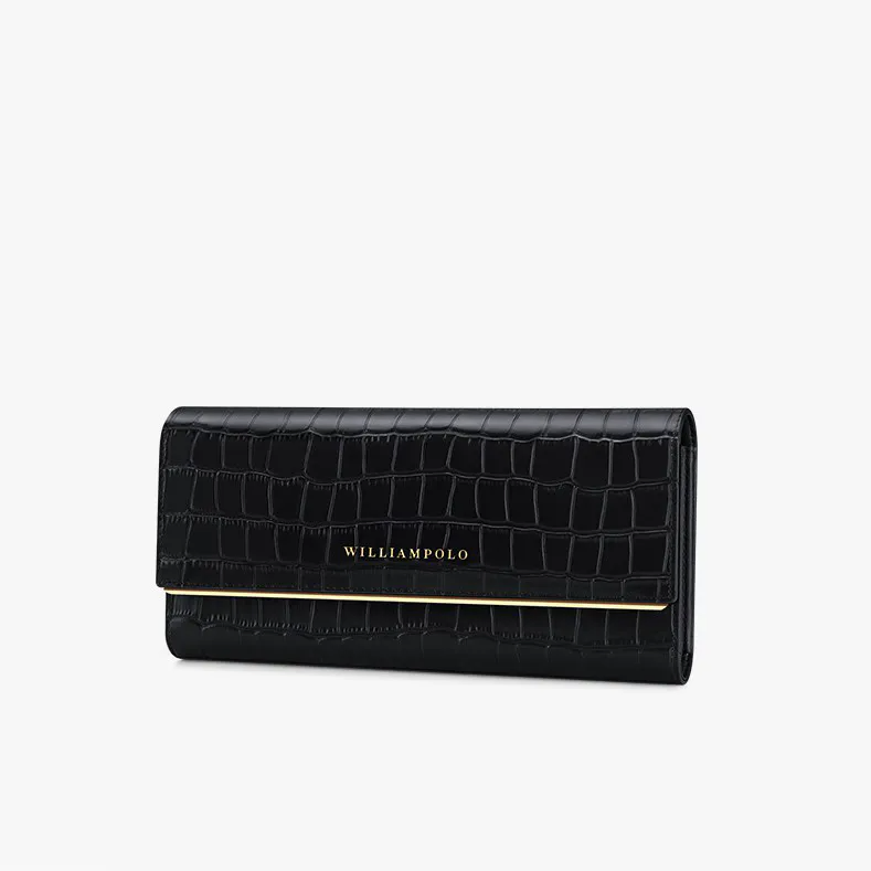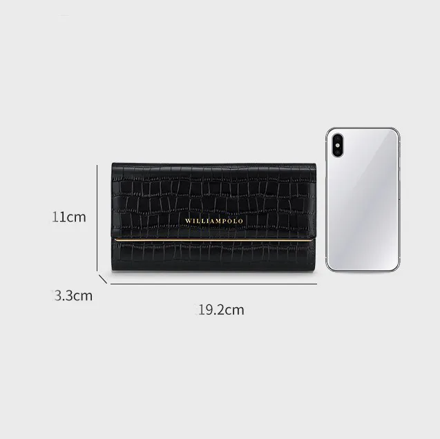 Color: The purse features a classic black color, providing a sleek and versatile look.Upper Material: Genuine leather makes up the exterior, ensuring a luxurious and durable texture.Brand: William POLO designs this purse, known for its refined and stylish accessories.Cortical Features: The crocodile pattern adorns the purse, adding a distinctive and elegant touch.Style: The urban simplicity style offers a modern and streamlined aesthetic, perfect for everyday use.Folding Pattern: The 3-fold construction allows for efficient organization within a compact form.Pattern Type: The crocodile pattern enhances the purse’s unique and sophisticated appearance.Size: With dimensions of 19.2 cm in length and 11 cm in width, the purse balances functionality with a refined design.