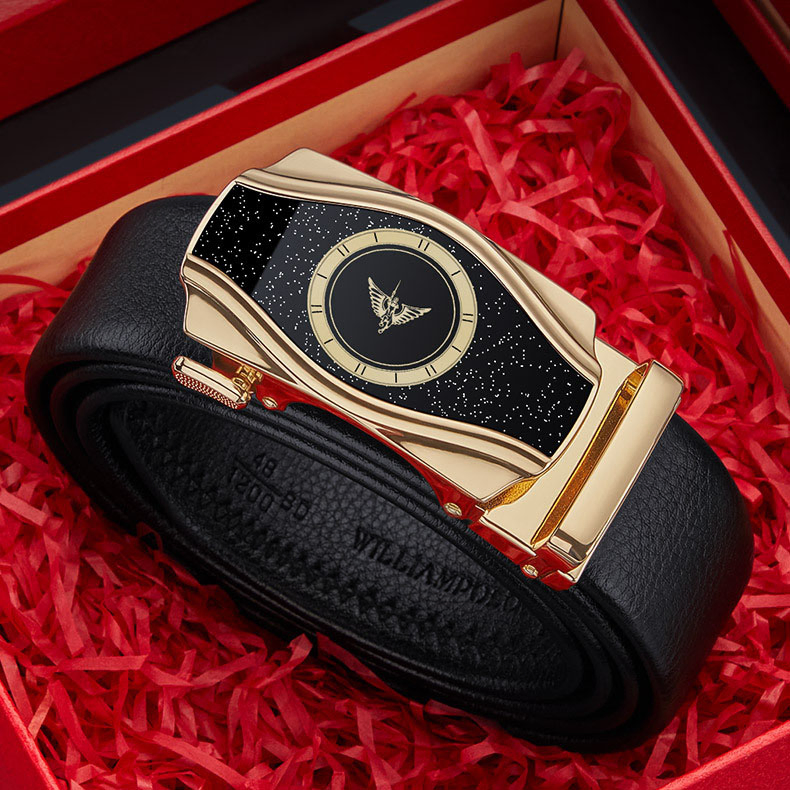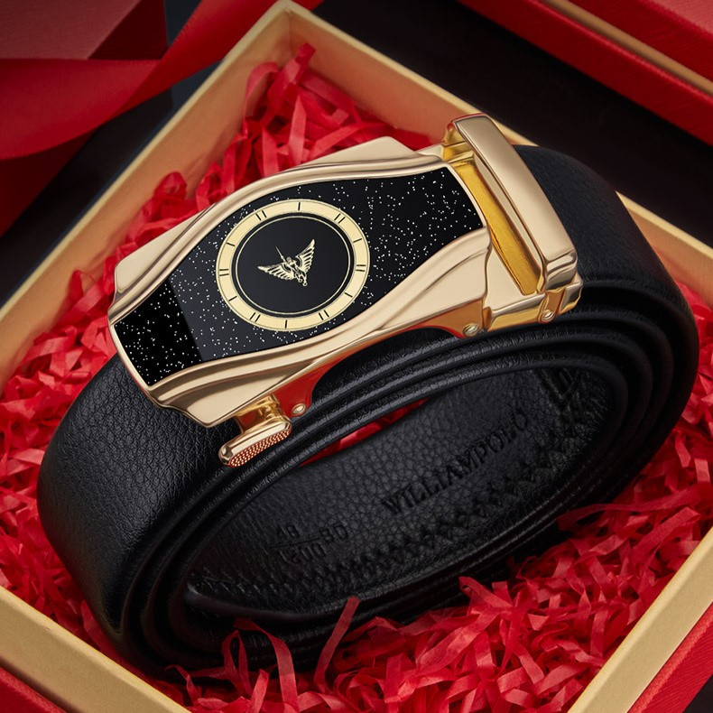 Buckle Color: The buckle showcases a stylish combination of gun and gold for a striking effect.Belt Color: The belt’s black color offers a timeless and versatile choice for any wardrobe.Brand: William POLO brings a high level of design and quality to this belt.Upper Material: Genuine leather gives the belt both a luxurious feel and long-lasting durability.Fastening Method: The automatic buckle provides a quick and efficient way to secure the belt.Lining: The polyester lining enhances the belt’s comfort and extends its lifespan.Pattern: The solid color design ensures a sleek and sophisticated look.Length: At 120 ”, the belt accommodates a wide range of waist sizes comfortably.Width: The 3.8 ” width of the belt delivers a balanced and elegant appearance.Weight: Weighing 350 gm, the belt feels robust and substantial.