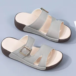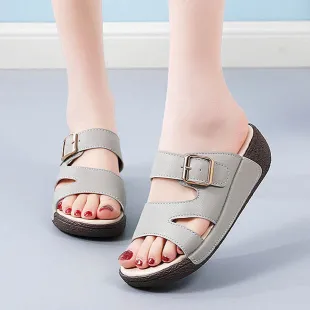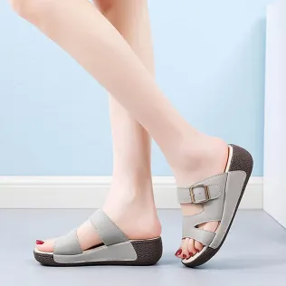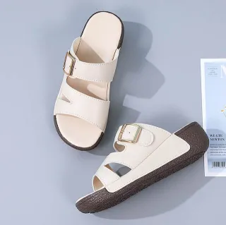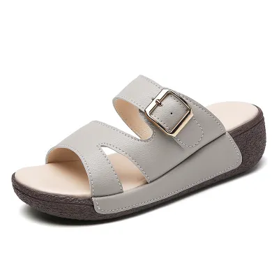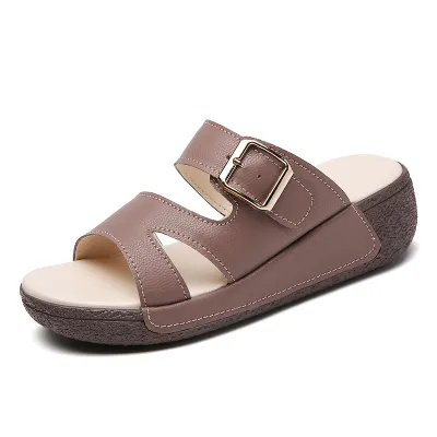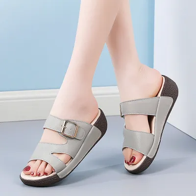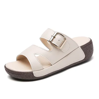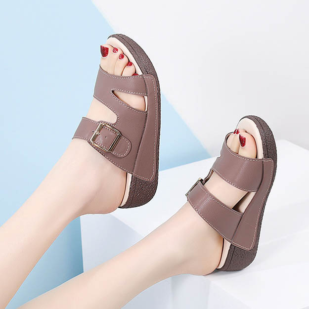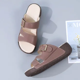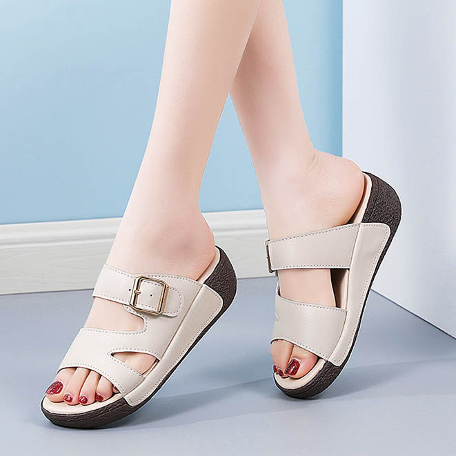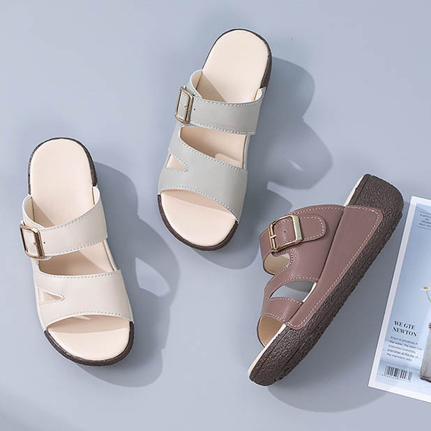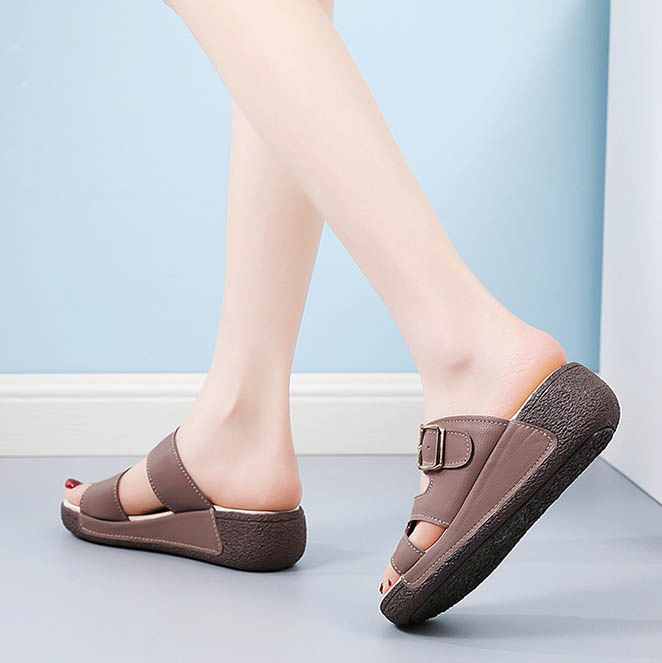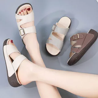 Color: The sandal is offered in bean paste color, classic beige, and versatile gray.Upper Material: Genuine leather provides a luxurious and durable finish.Outsole Material: The rubber sole ensures flexible support and reliable traction.Insole Material: PU leather offers soft, cushioned comfort for extended wear.Toe Shape: The open toe design adds a stylish and airy touch.Closure Type: The slip-on style allows for effortless and convenient wearing.Heel Height: The 5 cm heel height provides a chic lift while maintaining comfort.Pattern Type: The solid color pattern offers a clean and timeless look.Features: The sandal features breathability, wear-resistance, a lightweight build, and anti-slip properties for both practicality and style.
