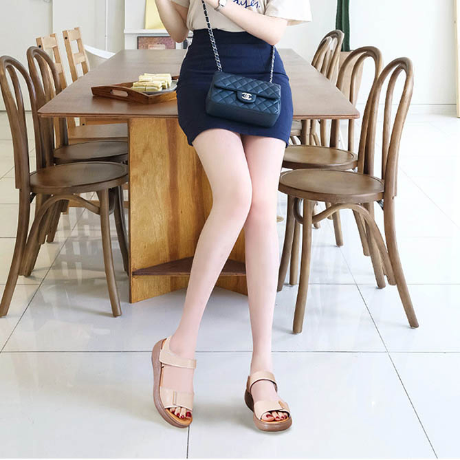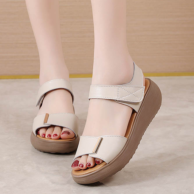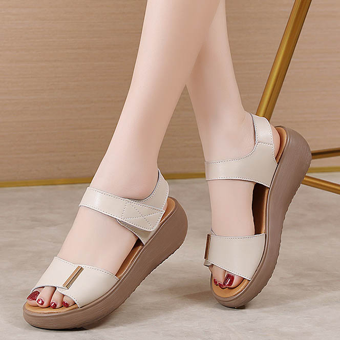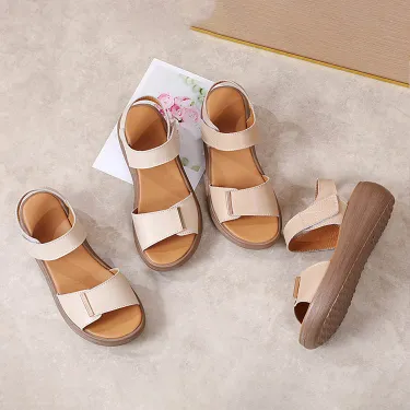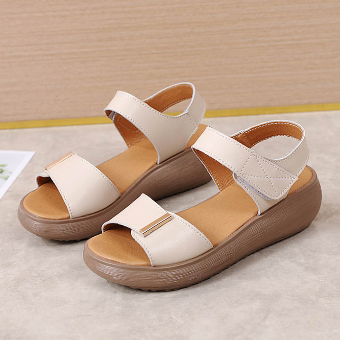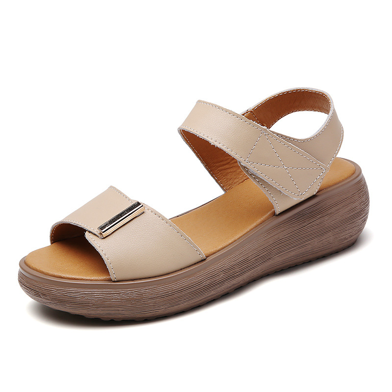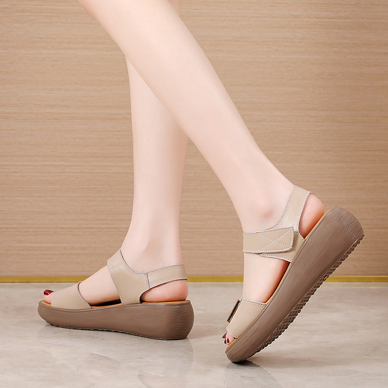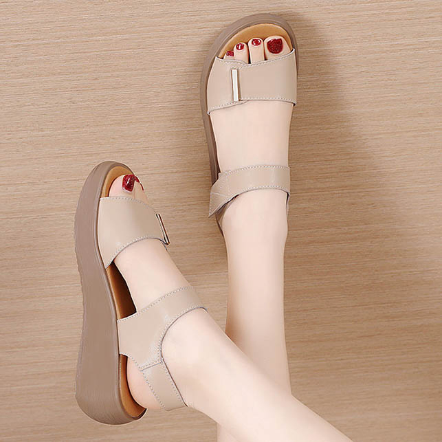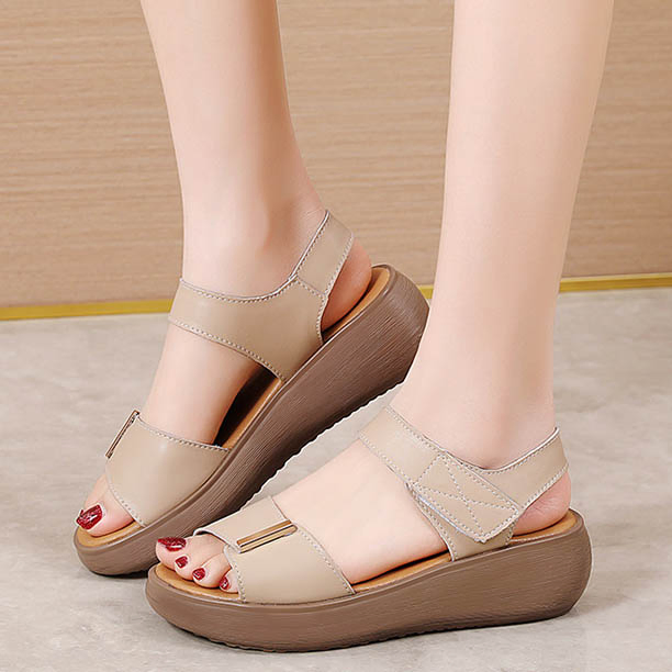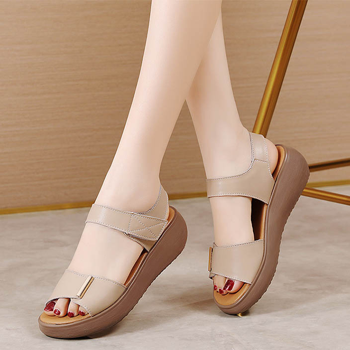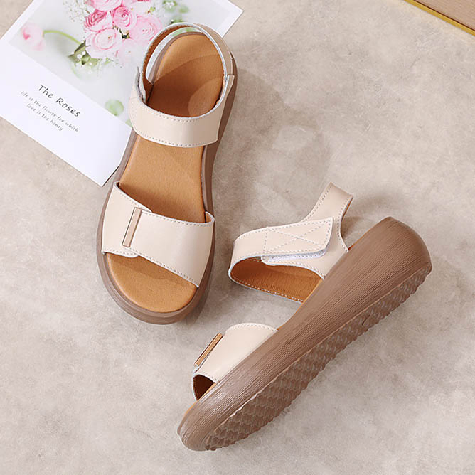 Color: The sandal is available in soft apricot and neutral beige.Upper Material: Genuine leather offers a high-quality and durable finish.Outsole Material: The rubber sole provides excellent traction and durability.Insole Material: PU leather ensures comfortable cushioning for all-day wear.Toe Shape: The open toe design adds a stylish and airy touch.Closure Type: The Velcro closure allows for easy adjustability and secure fit.Heel Height: The 5 cm heel height provides a chic lift while maintaining comfort.Pattern Type: The solid color pattern delivers a classic and versatile look.Features: The sandal features breathability, wear-resistance, a lightweight build, and anti-slip properties for practical and fashionable use.