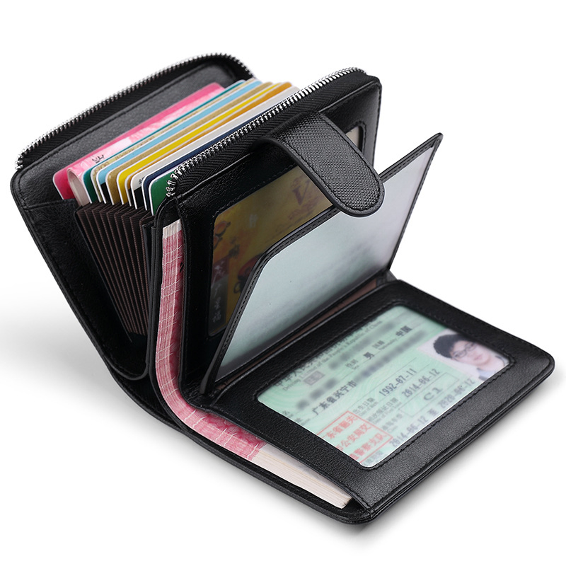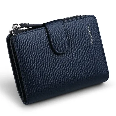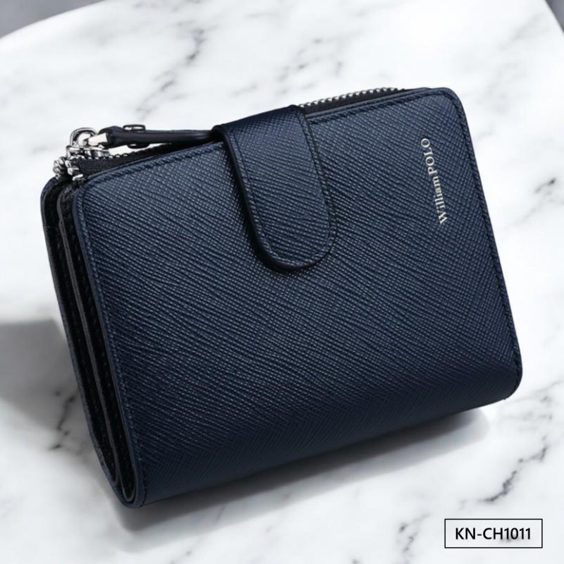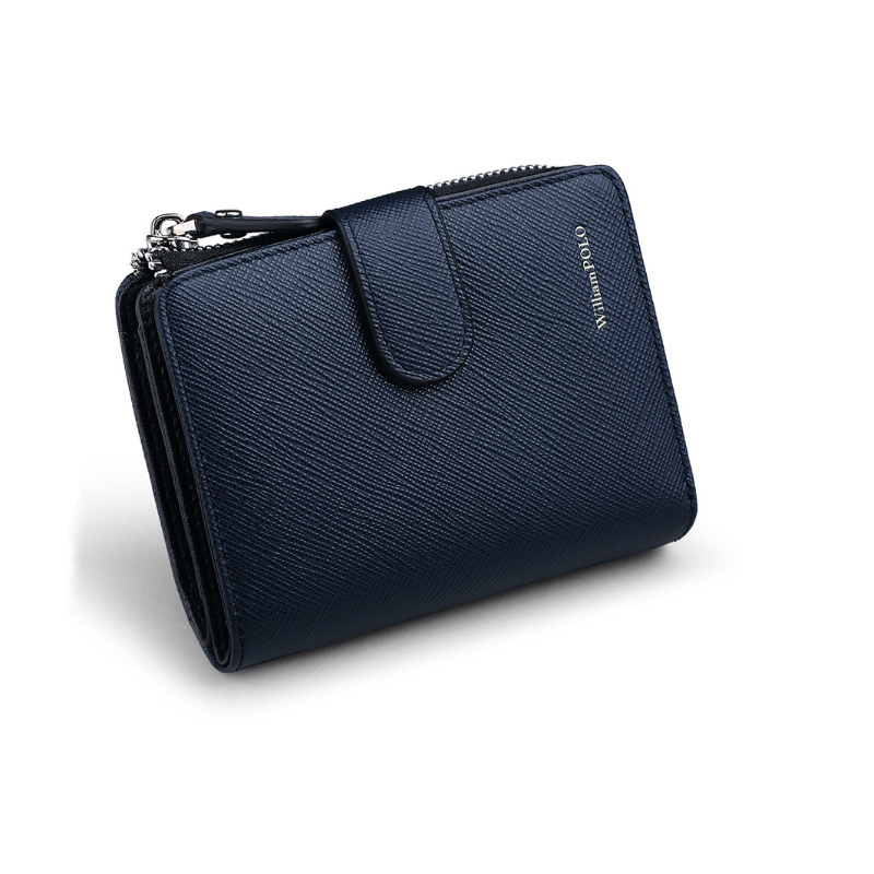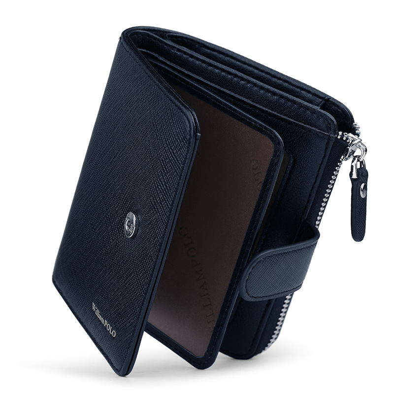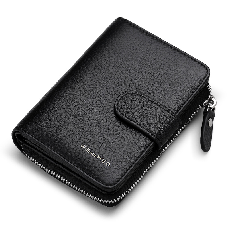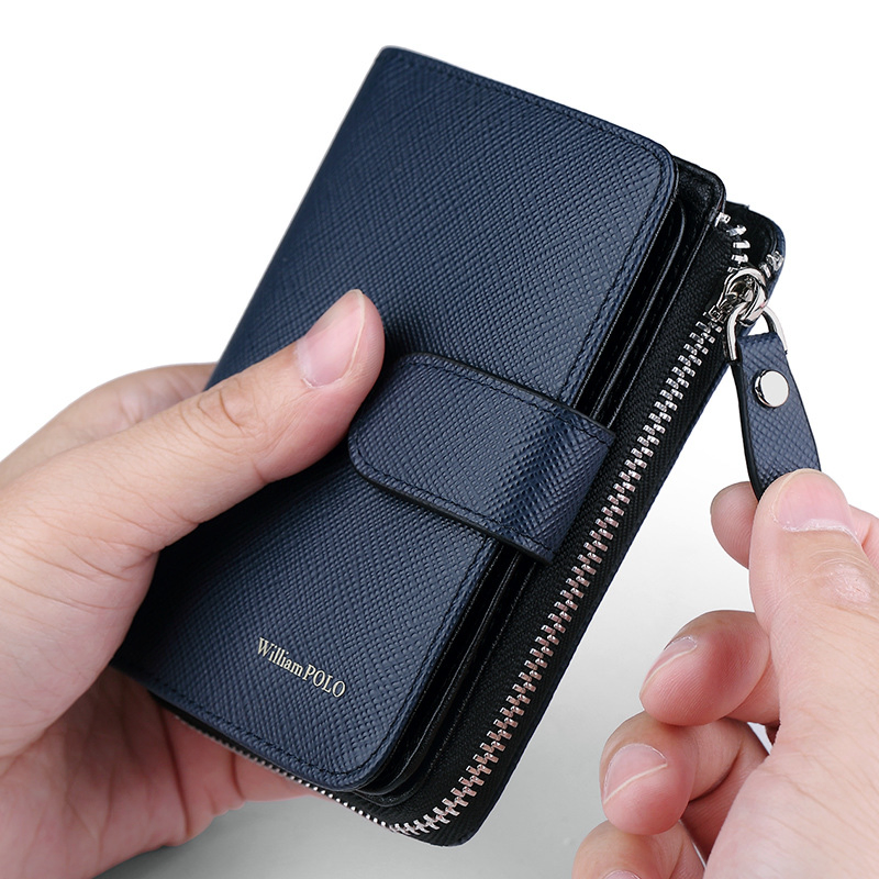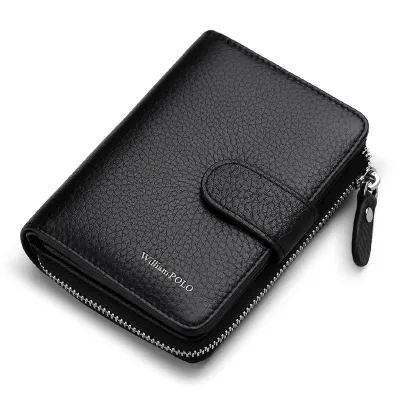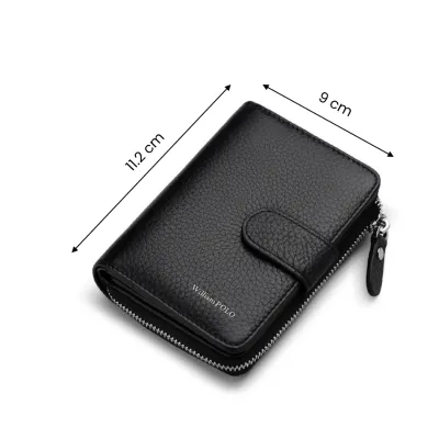 Color: The card holder comes in a choice of black lychee pattern or blue cross pattern.Brand: William Polo provides this card holder with sophisticated design and craftsmanship.Upper Material: Genuine leather covers the exterior, adding a touch of luxury.Opening Method: The card holder features a zipper for secure and convenient opening.Folding: It incorporates a two-fold design for practical and organized use.Lining: Polyester lining offers durability and a smooth interior surface.Pattern: The card holder showcases a solid color pattern for a sleek and versatile appearance.Size: Measuring 4.4" in height, 3.54" in length, and 1.29" in width, it provides a compact yet functional size.Weight: The card holder has a weight of 350 grams, ensuring a substantial and durable feel.