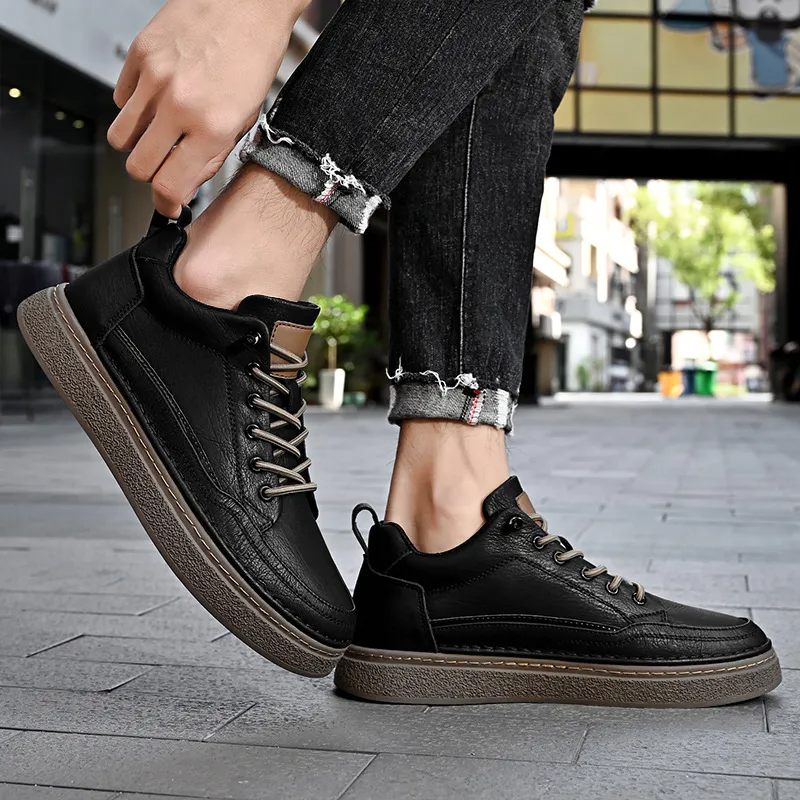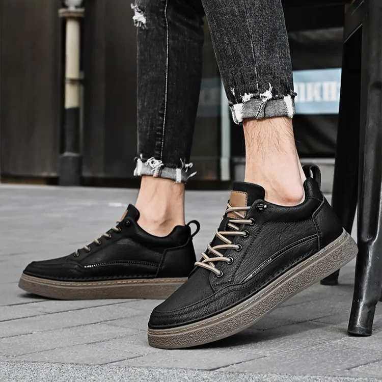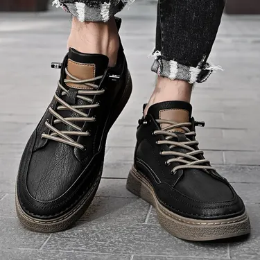 Color: The shoe is designed in a classic black hue.Upper Material: C-o-w-h-i-d-e leather constructs the shoe's upper, ensuring durability and a refined look.Outsole Material: Rubber forms the outsole, providing reliable traction and durability.Insole Material: PU leather lines the insole, offering comfort and support throughout wear.Toe Shape: Designed with a round head toe shape, the shoe prioritizes comfort and natural foot movement.Closure Type: It features a lace-up closure for a secure and adjustable fit.Pattern Type: The shoe showcases a solid pattern, maintaining a clean and timeless aesthetic.Features: Engineered for breathability, wear-resistance, lightweight feel, and anti-slip properties, suitable for various activities and daily wear.