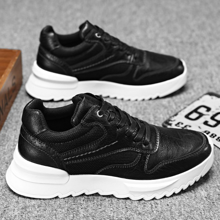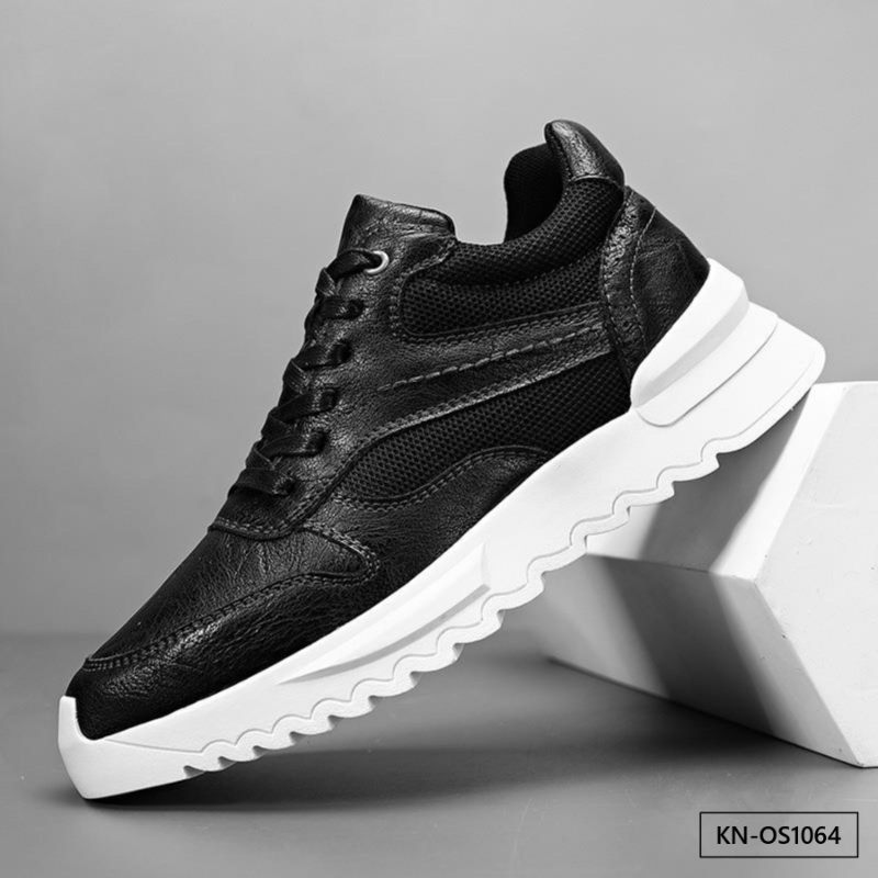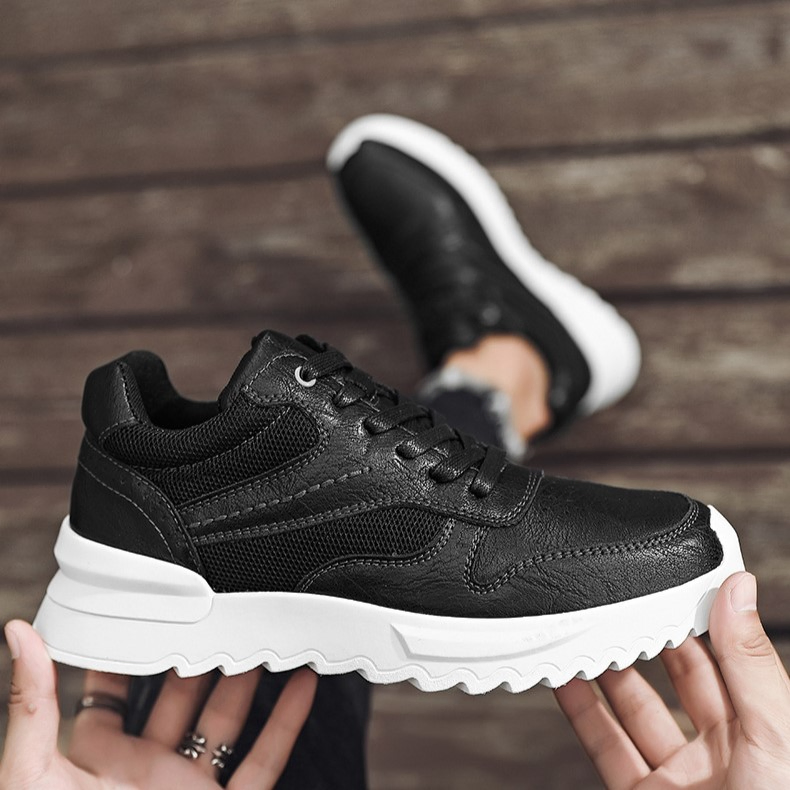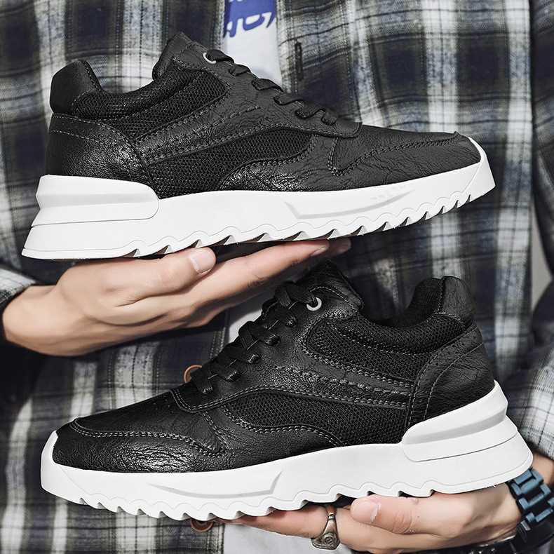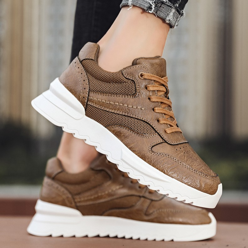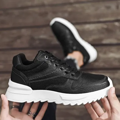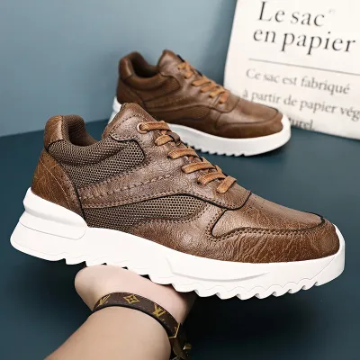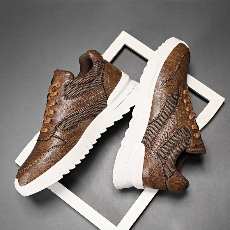 Color: The shoe features a blend of black and brown tones for its aesthetic appeal.Upper Material: PU leather constitutes the shoe's upper, ensuring durability and a stylish appearance.Outsole Material: A rubber sole provides the shoe with excellent grip and durability for various surfaces.Insole Material: PU leather lines the insole, delivering comfort and support throughout wear.Toe Shape: The shoe boasts a rounded toe shape, enhancing comfort and accommodating natural foot movements.Closure Type: It utilizes a lace-up closure system, allowing for a secure and customizable fit.Pattern Type: The shoe exhibits a solid pattern design, contributing to its timeless look and versatility.Features: Engineered with breathability, wear-resistance, lightweight construction, and anti-slip properties, catering to active lifestyles.