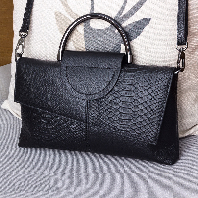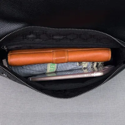 Color: Available in classic Black for a versatile and timeless look.Upper Material: Crafted from genuine leather for a luxurious and durable finish.Hardness: The handbag has a soft texture for comfortable use.Number of Shoulder Straps: Includes a single shoulder strap for easy carrying.Opening Method: Features a package cover type opening for secure and stylish access.Lining Texture: The interior is lined with smooth PU leather.Pattern Type: The handbag presents a sleek, solid color design.Size: It measures 10.23" in length, 5.11" in height, and 1.18" in width.