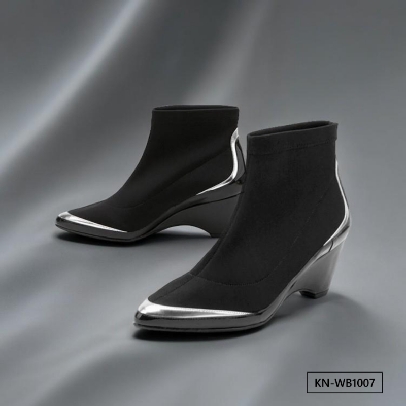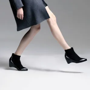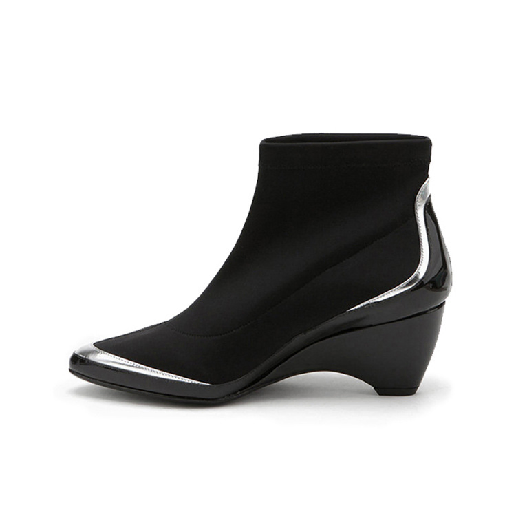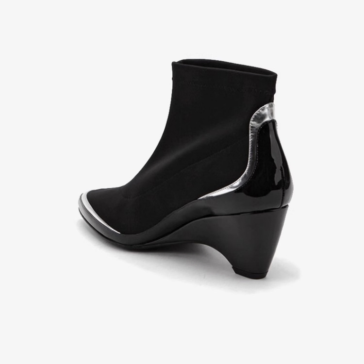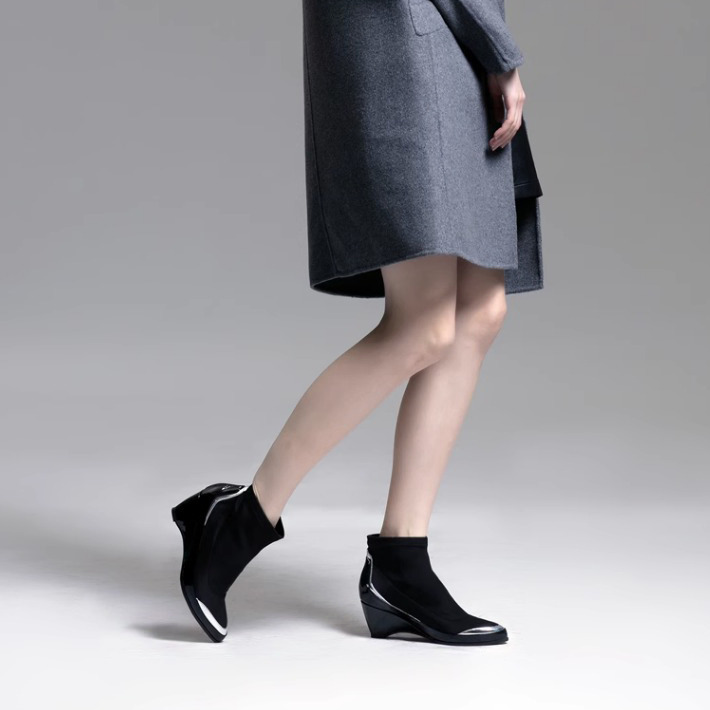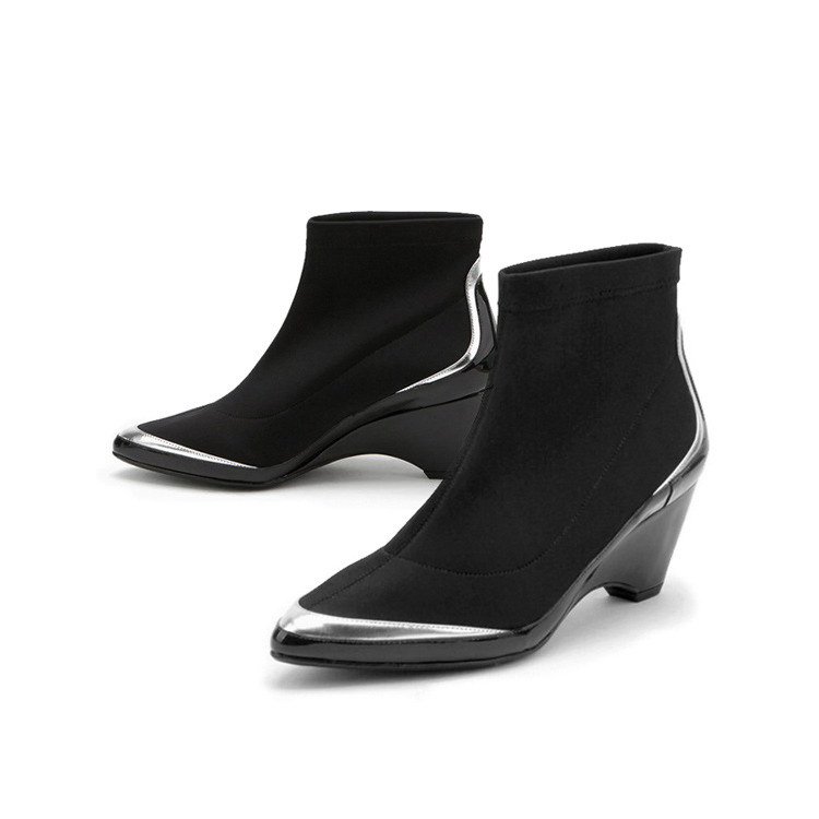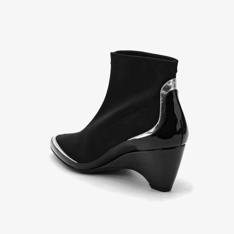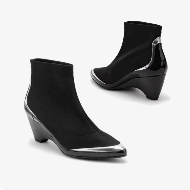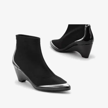 Color: The boot is offered in Black, providing a sleek and versatile color that complements various outfits.Upper Material: The combination of C-o-w-h-i-d-e and stretch fabrics creates a flexible and durable upper, ensuring both style and comfort.Outsole Material: The rubber sole delivers excellent grip and durability, offering reliable traction on different surfaces.Insole Material: The PU Leather insole provides cushioned support, enhancing overall comfort during wear.Toe Shape: The pointed toe shape adds a sophisticated and fashionable touch, while maintaining a snug fit.Closure Type: The slip-on design ensures effortless wear and removal, providing convenience and a secure fit.Pattern Type: The solid pattern gives the boot a timeless and clean appearance, suitable for various occasions.Features: The boot is engineered to be breathable, wear-resistant, lightweight, and anti-slip, combining practicality with all-day comfort.