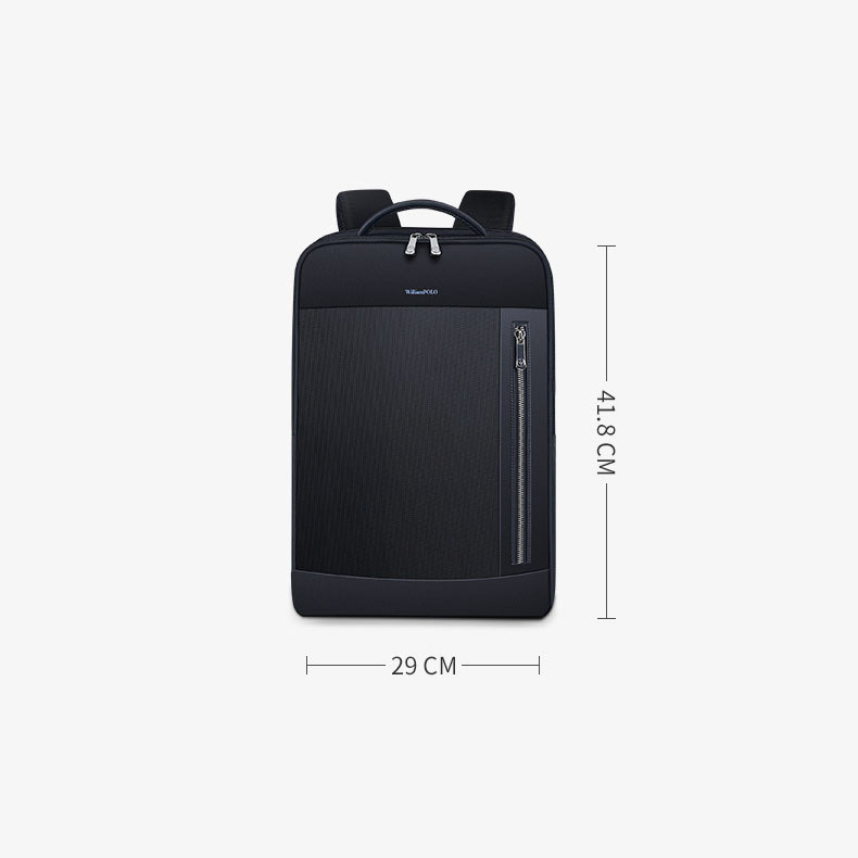 Color: The backpack features a sleek black color, providing a professional and versatile look.Brand: William POLO signifies high-quality craftsmanship and refined style.Upper Material: The combination of microfiber leather and Oxford cloth ensures durability and a premium feel.Number of Shoulder Straps: The double air cushion straps offer superior comfort and even weight distribution.Opening Method: The zipper opening guarantees easy access and secure closure for your belongings.Pattern: The solid color pattern adds a modern and understated elegance to the design.Lining Material: The polyester lining enhances the backpack’s longevity and protects its contents.Features: The backpack is waterproof, wear-resistant, shock-resistant, and multifunctional, making it ideal for various needs.Accommodated Computer Size: It fits a 14-inch computer, accommodating most laptops comfortably.Bag Size: With dimensions of 16.45" (H) x 11.41" (L) x 4.44" (W), the backpack offers a compact yet spacious design.Weight: Weighing 1 kg, the backpack remains lightweight and easy to carry.