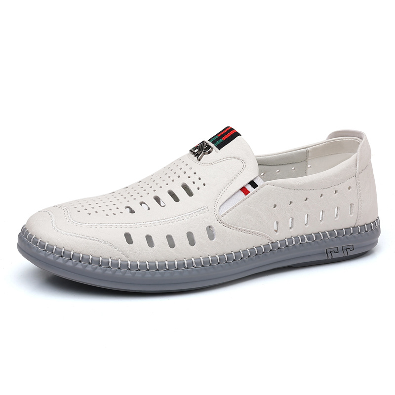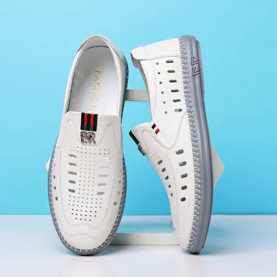 Color: This shoe is available in a crisp white hue.Upper Material: C-o-w-h-i-d-e genuine leather provides a durable and luxurious feel.Outsole Material: The PU rubber combination sole offers a blend of flexibility and durability.Toe Shape: It features a closed toe design for added protection and comfort.Closure Type: You can slip these shoes on effortlessly.Pattern Type: The shoe showcases a solid pattern for a timeless and sophisticated look.Features: These shoes are breathable, resistant to wear, lightweight, and equipped with effective anti-slip properties.